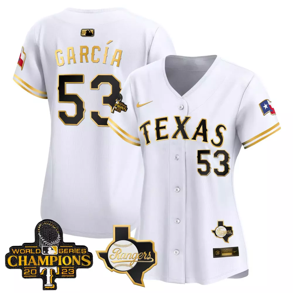 Adolis Garcia 2023 Black Gold Women’s Texas Rangers World Series Champions Vapor Premier Jersey | Limited Edition Fan Gear | For Men, Women & Youth;Adolis Garcia 2023 Texas Rangers Light Blue Stitched Jersey | Name Patch | Men’s Style | Fan Gear for Men, Women & Youth;Adolis Garcia 2023 Texas Rangers Stitched Jersey | White, Green & Red | Replica Fan Gear for Men, Women & Youth;Adolis Garcia 2023 Texas Rangers World Series Champions Jersey | White Gold Vapor Premier Limited Edition | Fan Gear for Men, Women & Youth;Adolis Garcia 2024 Black Gold Women’s Texas Rangers Jackie Robinson Patch Jersey | Stitched Vapor Premier | Limited Edition Fan Gear | For Men, Women & Youth