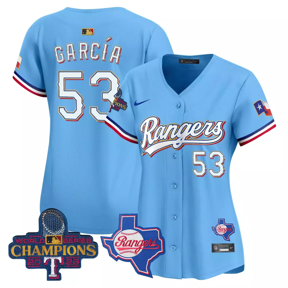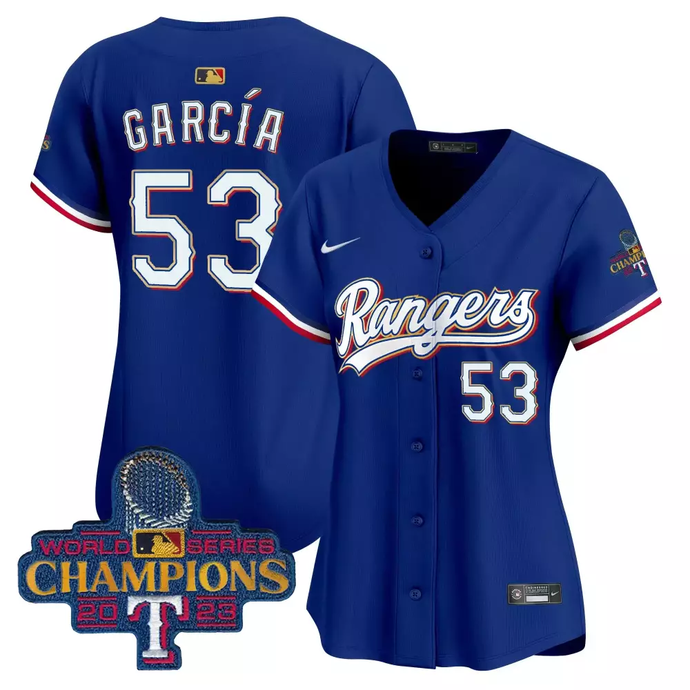 Adolis Garcia 53 Texas Rangers White Stitched Jersey | Men’s Name Patch 2023 | Limited Edition Fan Gear | For Men, Women & Youth;Adolis Garcia 53 Texas Rangers Women’s 2023 World Series Champions Light Blue Stitched Jersey | Fan Gear for Game Day | For Women;Adolis Garcia 53 Texas Rangers Women’s Light Blue Stitched Jersey | Name Patch 2023 World Series Champions | Fan Gear for Game Day | For Women;Adolis Garcia 53 Texas Rangers Women’s Royal Stitched Jersey | 2023 World Series Champions | Limited Edition Fan Gear | For Women;Adolis Garcia 53 Texas Rangers Women’s Stitched Jersey | White 2023 Name Patch | Fan Gear for Game Day | For Women