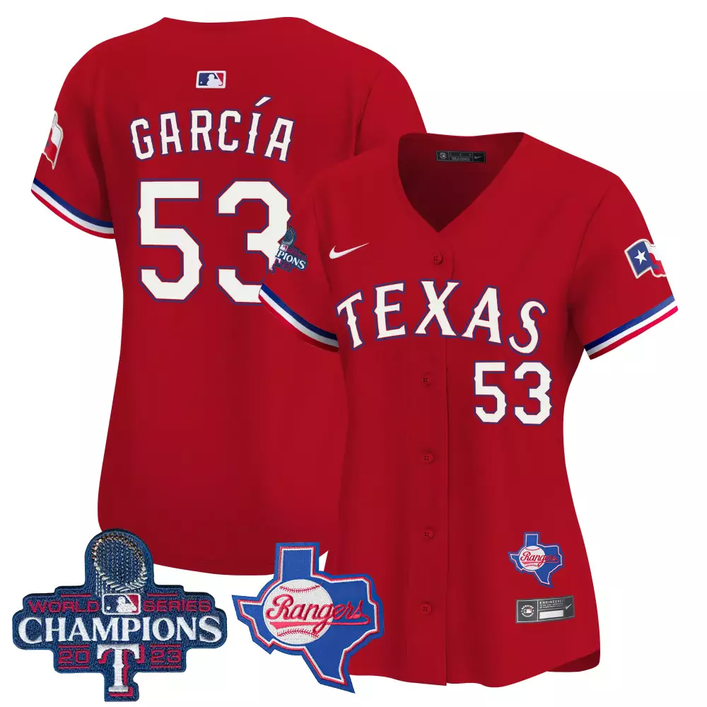 Adolis Garcia Red Women’s Texas Rangers Mexico Flag Jersey | All Stitched | Fan Gear for Game Day | For Men, Women & Youth;Adolis Garcia Red Women’s Texas Rangers Mexico Texas Patch Vapor Premier Limited Jersey | All Stitched | For Men, Women & Youth;Adolis Garcia Red Women’s Texas Rangers Mexico Vapor Premier Limited Jersey | All Stitched | Fan Gear for Game Day | For Men, Women & Youth;Adolis Garcia Red Women’s Texas Rangers World Series Champions Vapor Premier Limited Jersey V2 | All Stitched | For Men, Women & Youth;Adolis Garcia Royal Men’s Texas Rangers 2023 World Series Champions City Connect Flex Base Jersey | All Stitched | For Men, Women & Youth