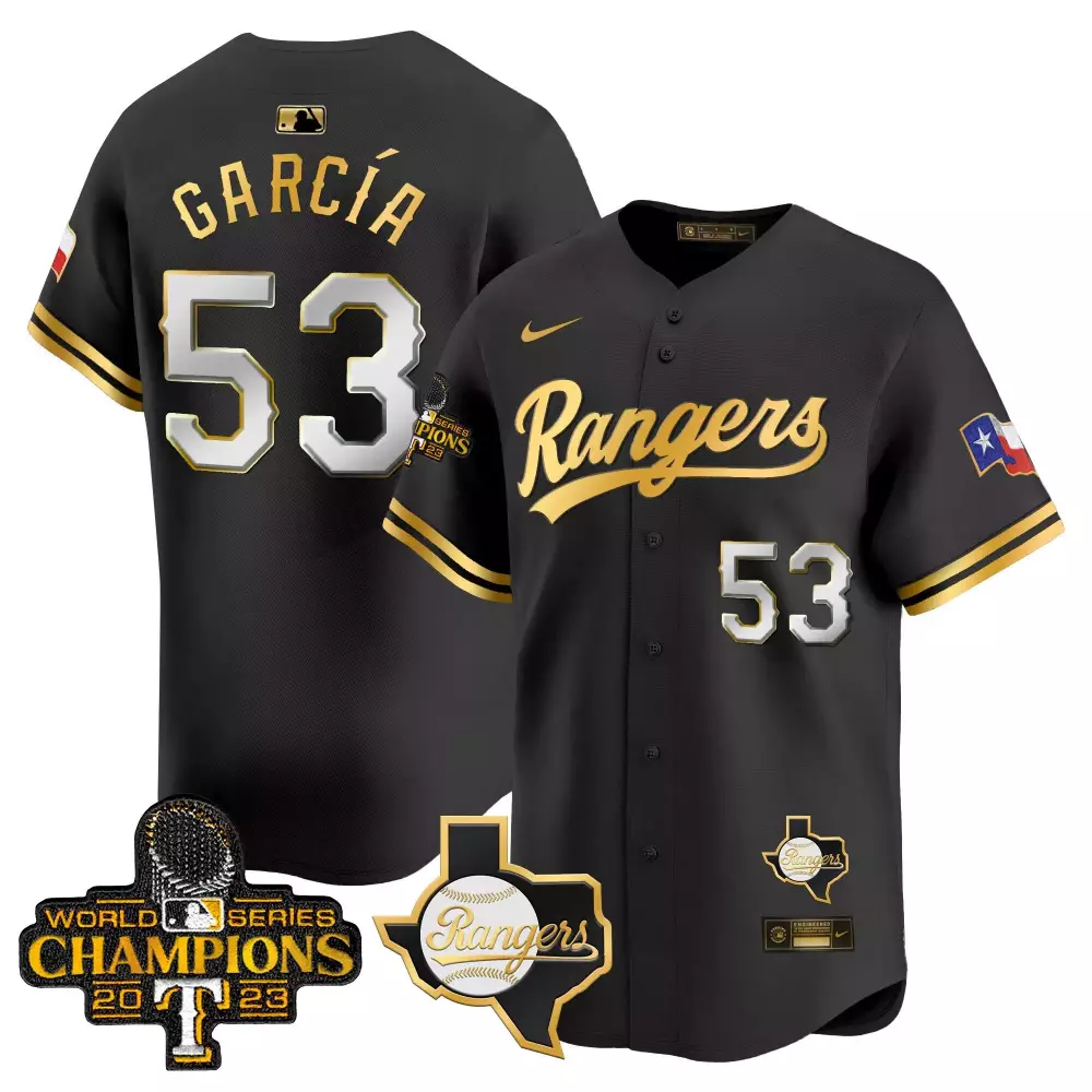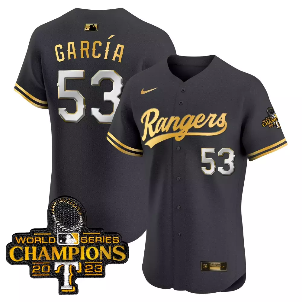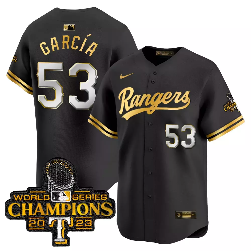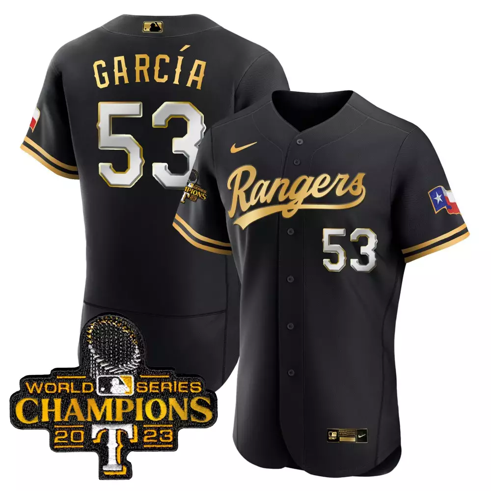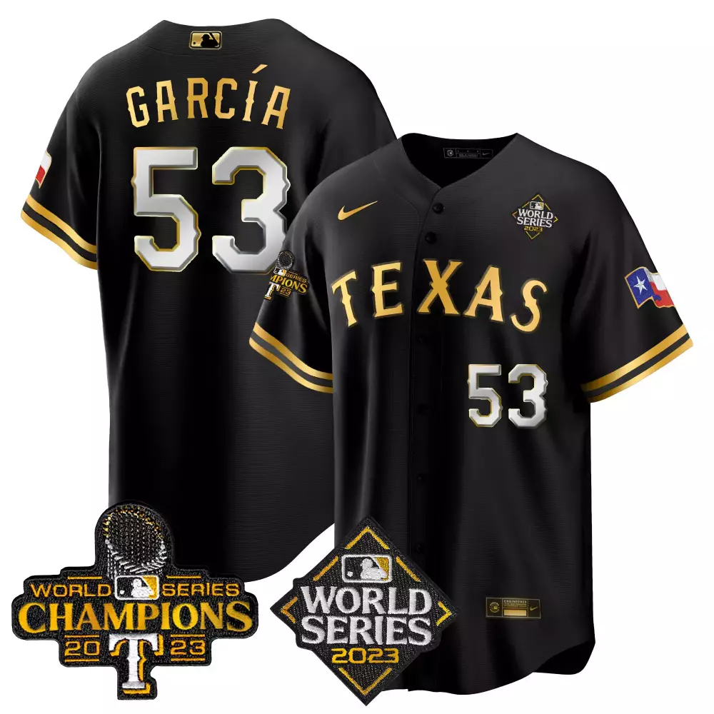 Adolis Garcia Texas Rangers 2023 World Series Champions Black Gold Flex Base Jersey V3 | All Stitched | Fan Gear for Men, Women & Youth;Adolis Garcia Texas Rangers 2023 World Series Champions Black Gold Gold Trim Vapor Premier Elite Jersey | All Stitched | Fan Gear for Men, Women & Youth;Adolis Garcia Texas Rangers 2023 World Series Champions Black Gold Gold Trim Vapor Premier Limited Jersey | All Stitched | Fan Gear for Men, Women & Youth;Adolis Garcia Texas Rangers 2023 World Series Champions Black Gold Gold Trim Vapor Premier Limited Jersey V2 | All Stitched | Fan Gear for Men, Women & Youth;Adolis Garcia Texas Rangers 2023 World Series Champions Black Gold Jersey | Stitched Cool Base | Fan Gear for Men, Women & Youth