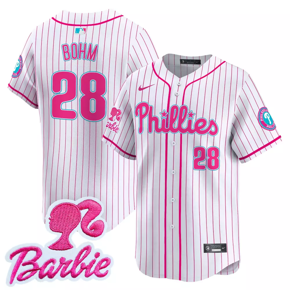 Alec Bohm Men’s Phillies 2024 Independence Day Jersey | Vapor Premier Limited Edition | Fan Gear for Game Day | For Men, Women & Youth;Alec Bohm Phillies Pink Stripe Jersey | Stitched Vapor Premier Limited Fan Gear | For Men, Women & Youth;Barbie Light Blue Phillies Barbie Patch Vapor Premier Jersey | Limited Edition Stitched Fan Gear | For Men, Women & Youth;Barbie Phillies Pink Stripe Jersey | Stitched Vapor Premier Limited Fan Gear | For Men, Women & Youth;Bohm 28 Phillies 2023 Stitched Jersey | Cream with Name Patch | Women’s Fan Gear | For Men, Women & Youth