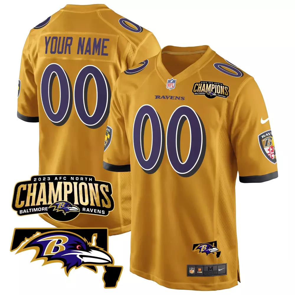 Baltimore Ravens 2023 AFC North Champions Patch Vapor Limited Jersey | Stitched Black Custom Design | Fan Gear for Men, Women & Youth;Baltimore Ravens 2023 Gold Custom Jersey | Maryland Patch Game Edition | Stitched Fan Gear for Men, Women & Youth;Baltimore Ravens 2023 Gold Custom Jersey | Maryland Patch Game Edition for Youth | Stitched Fan Gear;Baltimore Ravens 2023 Stitched Vapor Jersey | Black & Gold Custom Design | Fan Gear for Men, Women & Youth;Baltimore Ravens 2023 Stitched Vapor Jersey | Black & Purple Edition | Custom Fan Gear for Men, Women & Youth