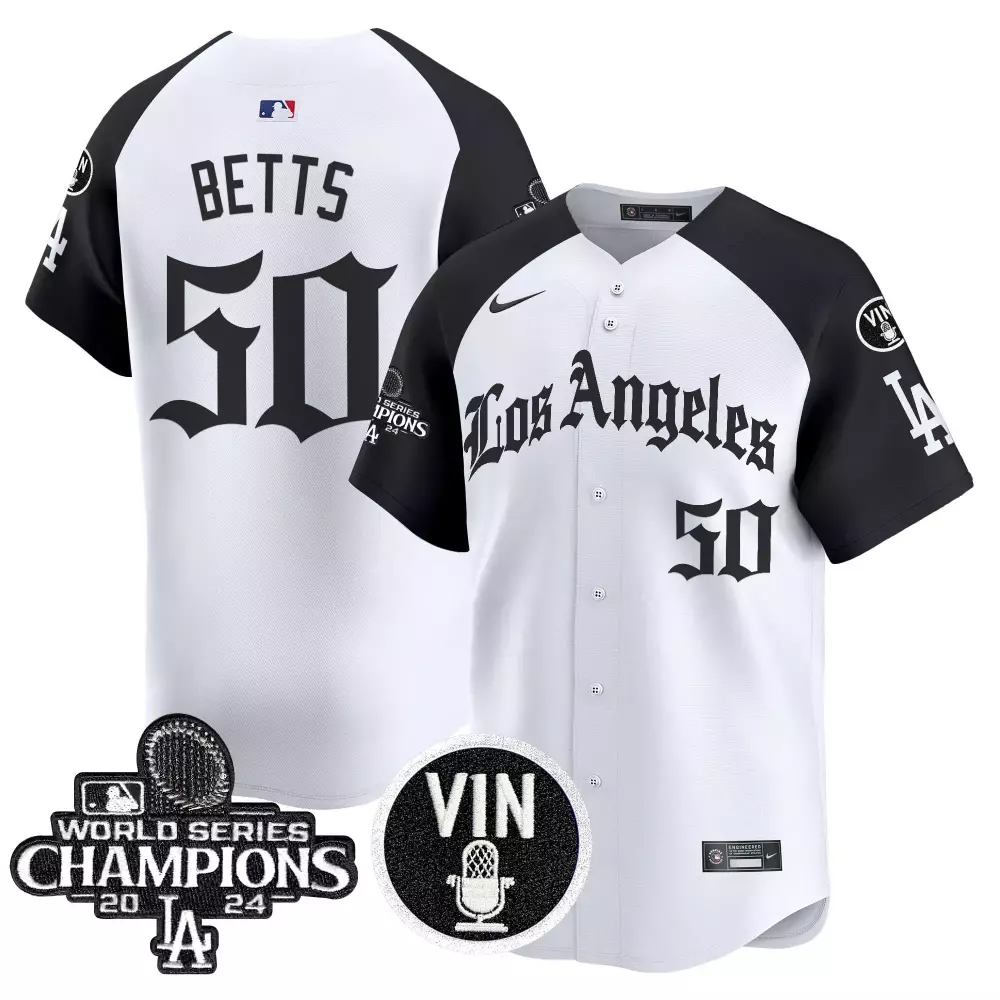 Betts 50 Dodgers 2024 Stitched World Series Champions Jersey | White and Black Vapor Style | For Men, Women & Youth