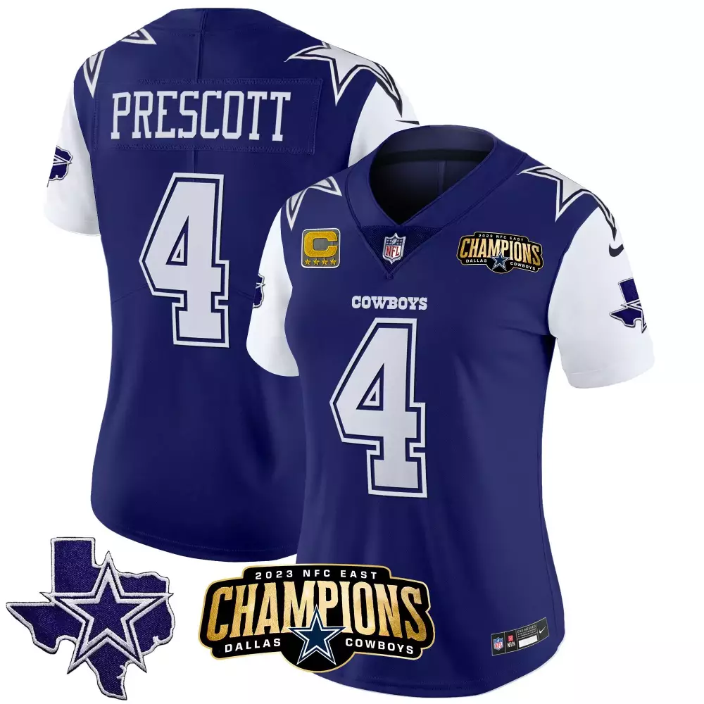 Dak Prescott Royal Women’s Dallas Cowboys 2023 NFC East Champions Patch Vapor Jersey | All Stitched | For Men, Women & Youth | Fan Gear