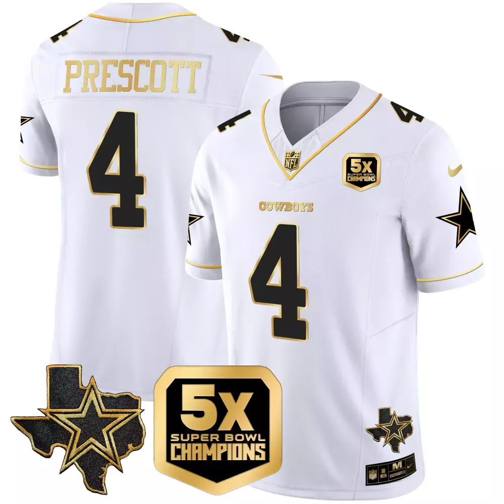Dak Prescott White Gold Men’s Dallas Cowboys 5X Super Bowl Champions Vapor Limited Jersey | All Stitched | For Men, Women & Youth | Limited Edition