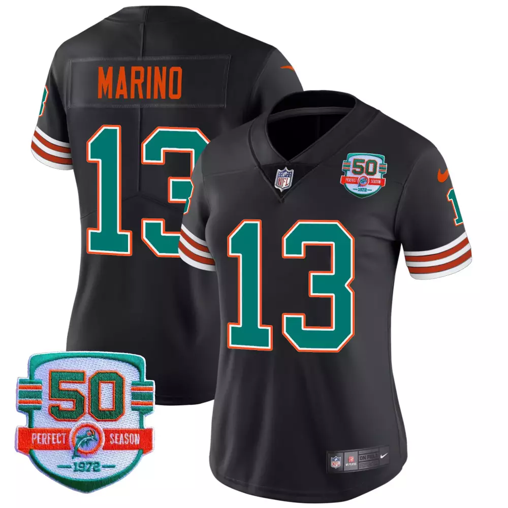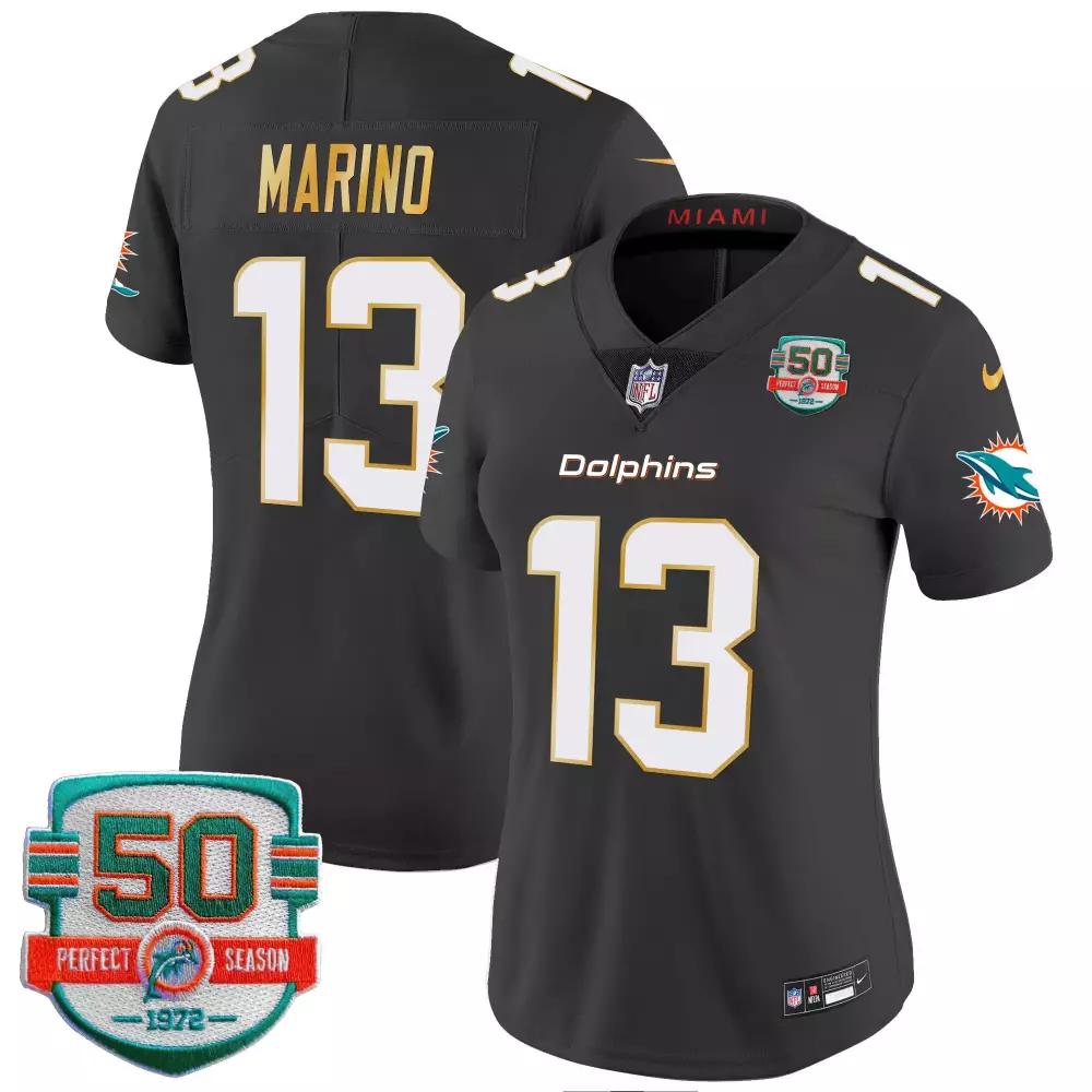 Dan Marino Miami Dolphins White Retired Player Jersey 9BI | Essential Fan Gear for All | For Men, Women & Youth;Dan Marino Miami Dolphins Women’s 2025 Rivalries Jersey | Pitch Blue Game Style | Fan Gear for All | For Men, Women & Youth;Dan Marino Miami Dolphins Women’s Black Limited Edition Vapor Jersey | Gold Trim | Stitched Fan Gear for Women & Youth;Dan Marino Miami Dolphins Women’s Black Throwback Vapor Jersey | Stitched Fan Gear for Women & Youth;Dan Marino Miami Dolphins Women’s Black Vapor Jersey | 50th Perfect Season Patch | Stitched Fan Gear for Women & Youth