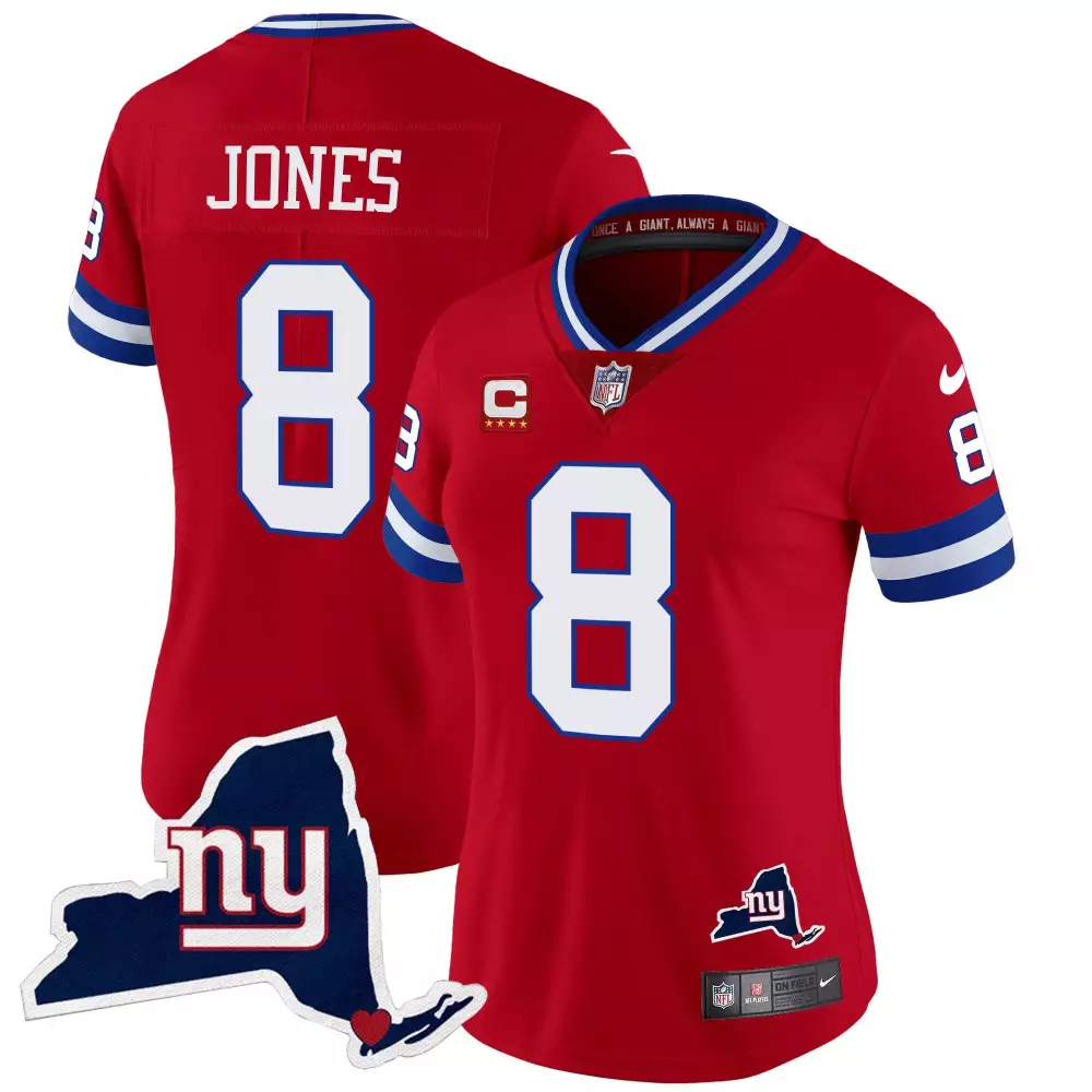 Daniel Jones New York Giants Vapor Gold Jersey | White Gold Stitched | Replica Fan Gear | For Men, Women & Youth;Daniel Jones New York Giants Vapor Gold Jersey | White Gold Stitched | Women’s Fan Gear | For Women & Youth;Daniel Jones New York Giants Women’s 100th Season State Patch Vapor Limited Jersey | Red | For Women & Youth;Daniel Jones New York Giants Women’s New York State Map Patch Limited Jersey | Red | For Women & Youth;Daniel Jones Red Legend Performance Top | New York Giants | Fan Gear for Men, Women & Youth