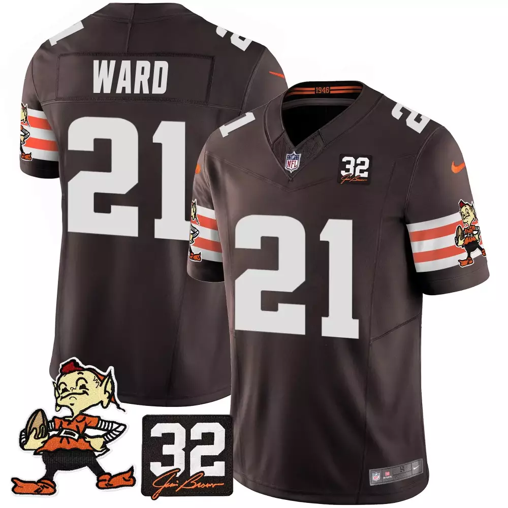 Denzel Ward Cleveland Browns 32 Jim Brown Memorial Patch Jersey | Stitched Gold Trim Fan Gear | For Men, Women & Youth;Denzel Ward Cleveland Browns 32 Jim Brown Memorial Patch Jersey | Stitched Gold Trim Fan Gear | For Men, Women & Youth;Denzel Ward Cleveland Browns 32 Jim Brown Memorial Vapor Limited Jersey V2 | Stitched Classic Design | For Men, Women & Youth;Denzel Ward Cleveland Browns Brown Game Jersey | Stylish Fan Gear for Game Day | For Men, Women & Youth;Denzel Ward Cleveland Browns Brown Game Jersey | Ultimate Fan Gear for Men, Women & Youth | Show Your Team Spirit