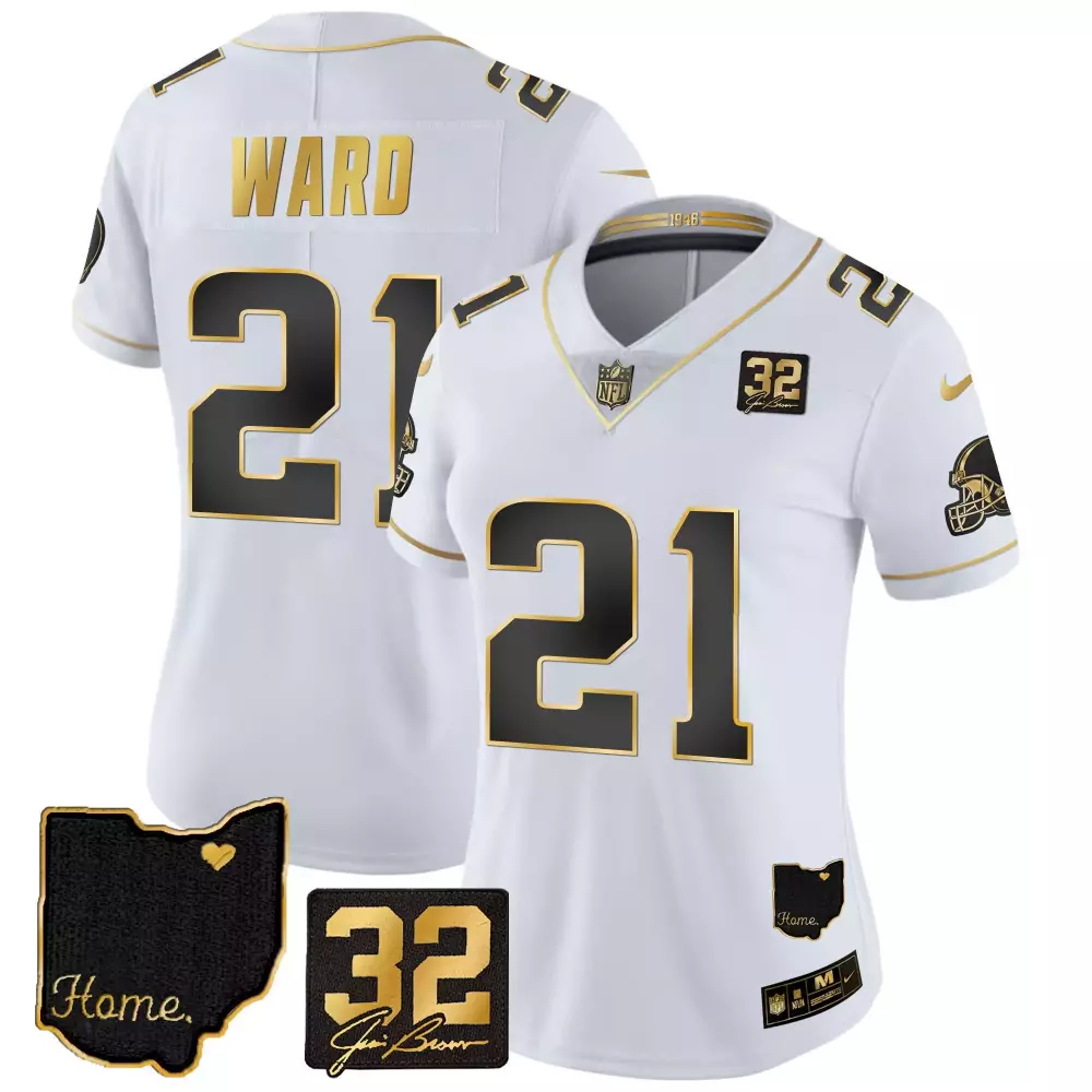 Denzel Ward Women’s Cleveland Browns 32 Jim Brown Memorial Jersey | Stitched Home Patch V3 | For Men, Women & Youth;Denzel Ward Women’s Cleveland Browns 32 Stitched Memorial Jersey | White | All Stitched | Fan Gear for Game Day | For Men, Women & Youth;Denzel Ward Women’s Gold Jersey | Cleveland Browns 32 Jim Brown Memorial Home Patch | Stitched Fan Gear for Women;Denzel Ward Women’s Gold Jersey | Cleveland Browns 32 Jim Brown Memorial Patch | Stitched Fan Gear for Women;Deshaun Watson 1946 Cleveland Browns 75th Anniversary Jersey | White | All Stitched | Limited Edition | For Men, Women & Youth