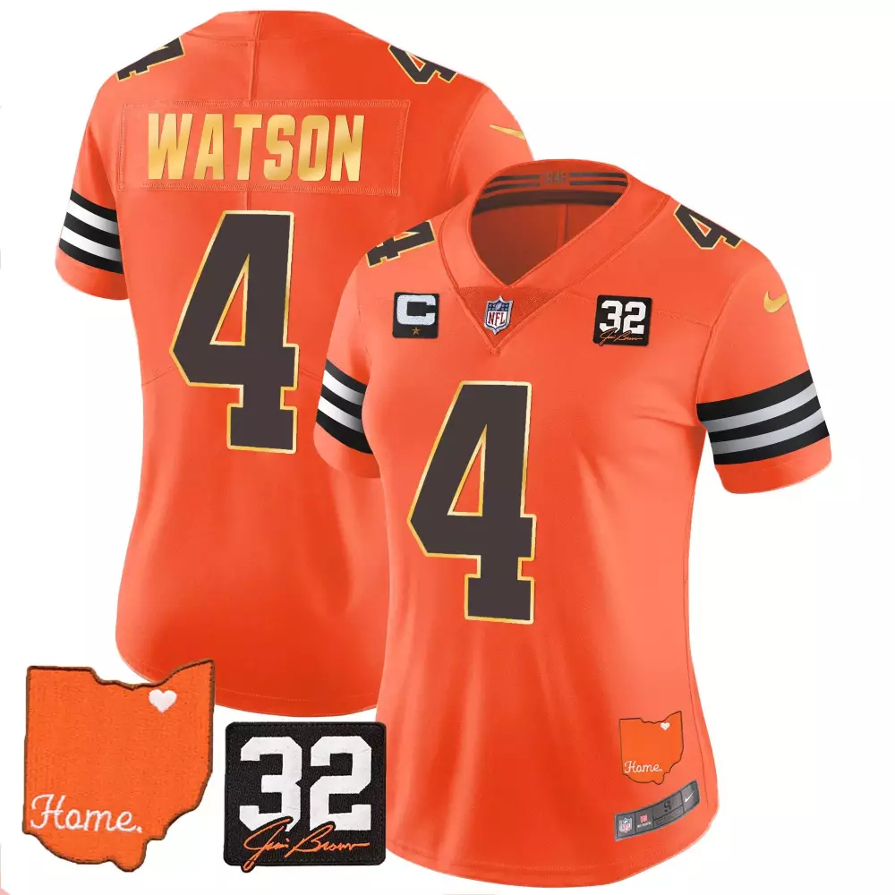 Deshaun Watson Cleveland Browns 32 Jim Brown Memorial Home Patch Gold Trim Jersey | Stitched Men’s Fan Gear | For Men, Women & Youth