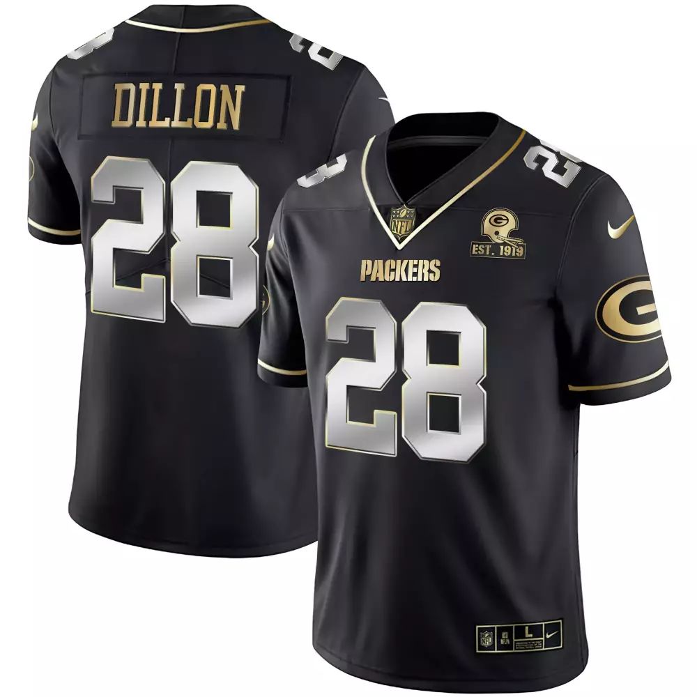 Dillon 28 Green Bay Packers Black Home Jersey | All Stitched 2023 | For Men, Women & Youth;Dillon 28 Green Bay Packers Black Stitched Jersey | 2023 Limited Edition Fan Gear | For Men, Women & Youth;Dillon 28 Green Bay Packers Black Stitched Jersey | 2023 Replica Fan Gear | For Men, Women & Youth;Dillon 28 Green Bay Packers Black Stitched Jersey | Name Patch Est 1919 | For Men, Women & Youth;Dillon 28 Green Bay Packers Black Stitched Vapor Jersey | 1919 Grit Frozen Steel Edition 2023 | For Men, Women & Youth