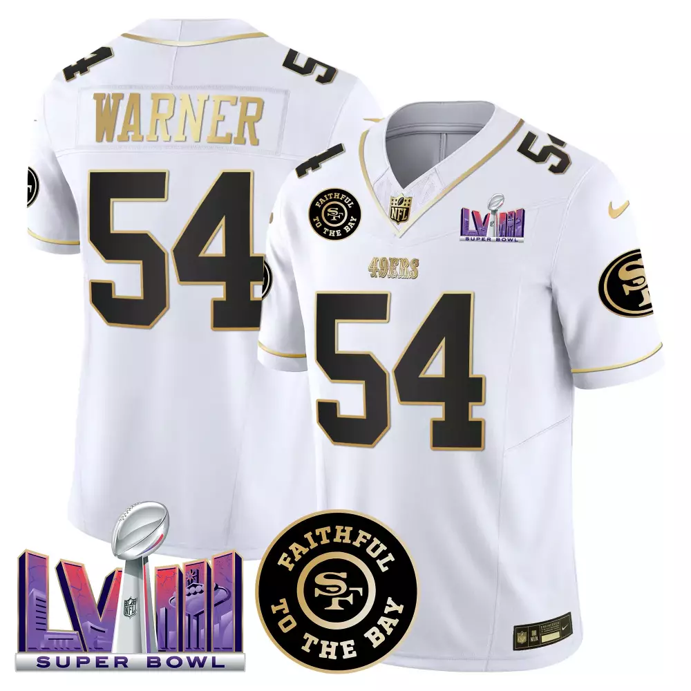 Fred Warner White Gold Men’s San Francisco 49ers Faithful Super Bowl LVIII Patch Vapor Jersey V2 | All Stitched Fan Gear | For Men
