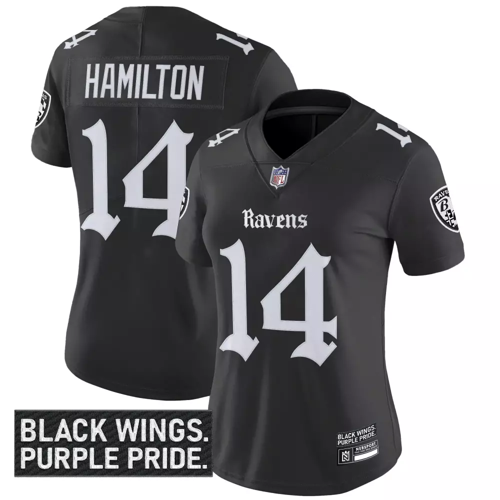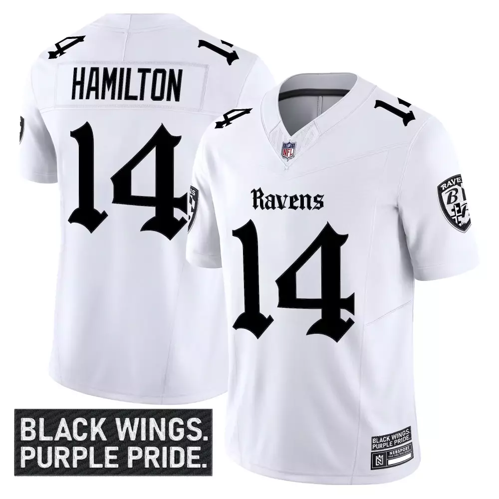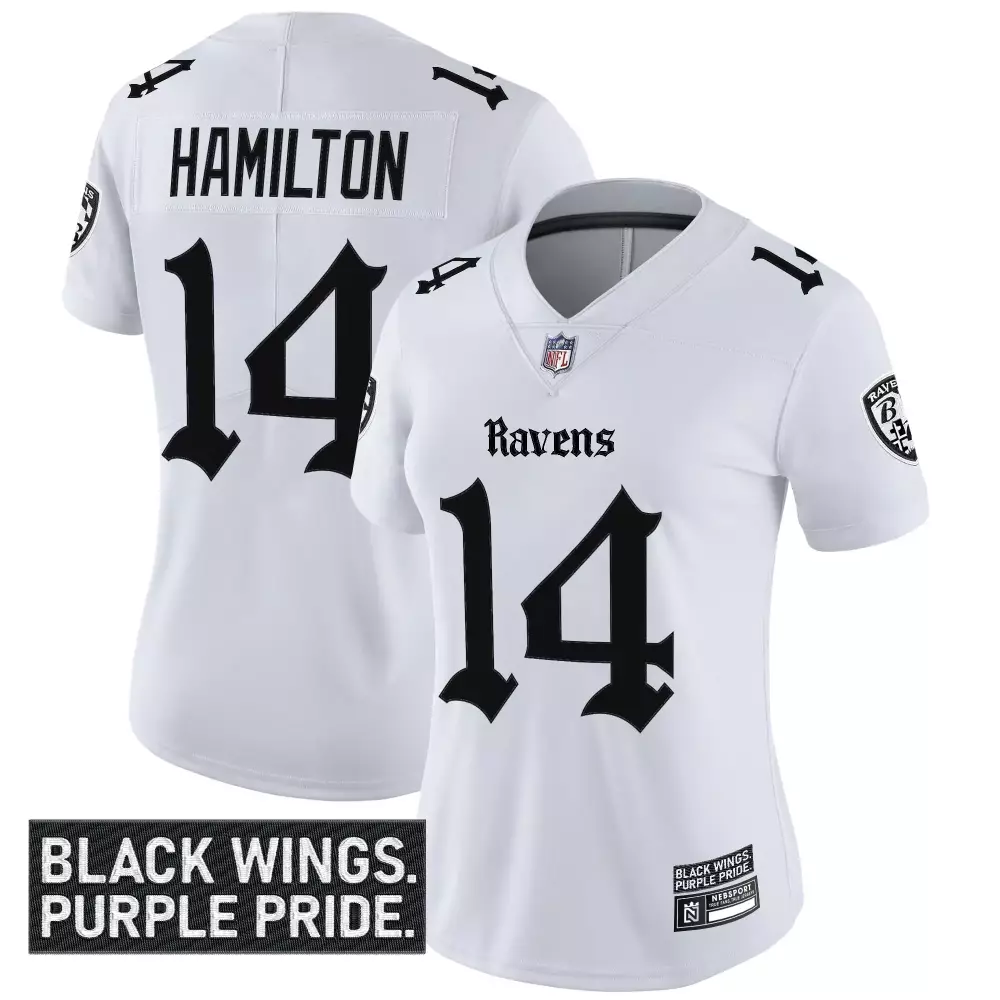 Hamilton 14 Men’s Vapor Jersey | Baltimore Ravens Maryland Flag Edition 30 Seasons Patch 2023 | Limited Edition Fan Gear | For Men, Women & Youth;Hamilton 14 Men’s White Baltimore Ravens Stitched Jersey | 2023 Name Patch | Replica Fan Gear | For Men, Women & Youth;Hamilton 14 Men’s Yellow Stitched Jersey | Baltimore Ravens 2023 Name Patch | Limited Edition Fan Gear | For Men, Women & Youth;Hamilton 14 Women’s Stitched Jersey | Baltimore Ravens White Black Wings Purple Pride Edition 2023 | Replica Fan Gear | For Men, Women & Youth;Hamilton 14 Women’s Stitched Name Patch Jersey | Baltimore Ravens Black 2023 | Limited Edition Fan Gear | For Men, Women & Youth