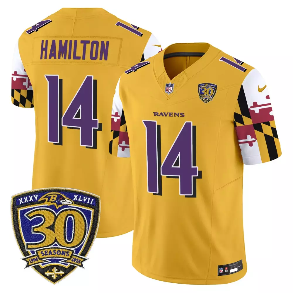 Hamilton 14 Men’s Vapor Jersey | Baltimore Ravens Maryland Flag Edition 30 Seasons Patch 2023 | Limited Edition Fan Gear | For Men, Women & Youth