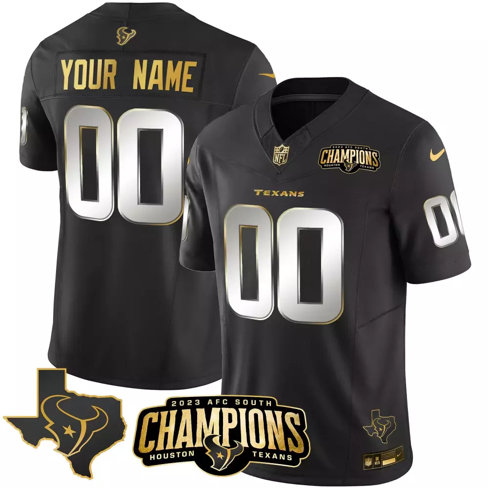 Houston Texans 2023 AFC South Champions Black Limited Youth Jersey | Gold Vapor Custom | Stitched Fan Gear | For Men, Women & Youth;Houston Texans 2023 AFC South Champions Black Men’s Jersey | Game Custom | Stitched Fan Gear | For Men, Women & Youth;Houston Texans 2023 AFC South Champions Game Jersey | Stitched Navy | Limited Edition Fan Gear | For Men, Women & Youth;Houston Texans 2023 AFC South Champions Gold Trim Vapor Jersey | Stitched Navy | Limited Edition Fan Gear | For Men, Women & Youth;Houston Texans 2023 AFC South Champions Gold Vapor Custom Jersey | Stitched Fan Gear for Men | For Men, Women & Youth