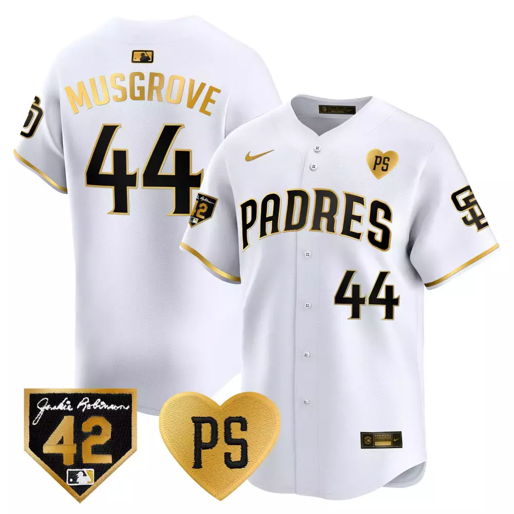 Jake Cronenworth Flex White Gold Padres Jersey | Black Limited Gold Style | For Men, Women & Youth;Joe Musgrove 2024 Padres Jersey | White Gold with Peter Robinson Patch | For Men, Women & Youth;Joe Musgrove 2024 Spring Training Padres Jersey | White Gold Style | For Men, Women & Youth;Joe Musgrove Black Women’s Padres Mexico Limited Edition Jersey | Stitched Vapor Premier | Fan Gear for Men, Women & Youth;Joe Musgrove Black Women’s Padres Mexico Premier Limited Jersey | Stitched Vapor Design | Fan Gear for Men, Women & Youth