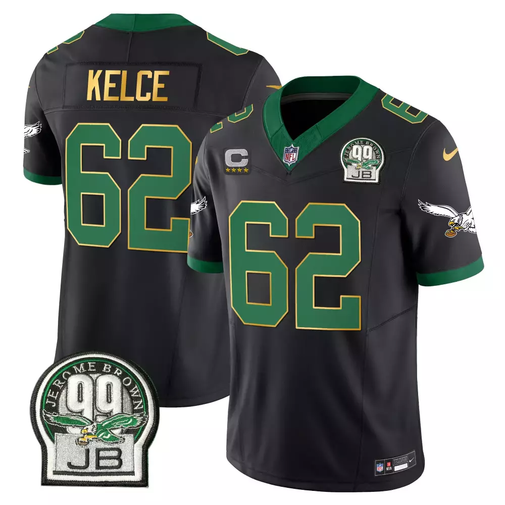 Jason Kelce Black Mens Jerome Brown Patch Kelly Green Gold Trim Jersey | Philadelphia Eagles | All Stitched | For Men, Women & Youth