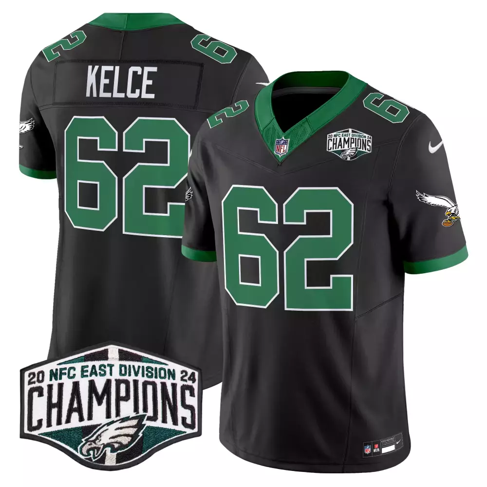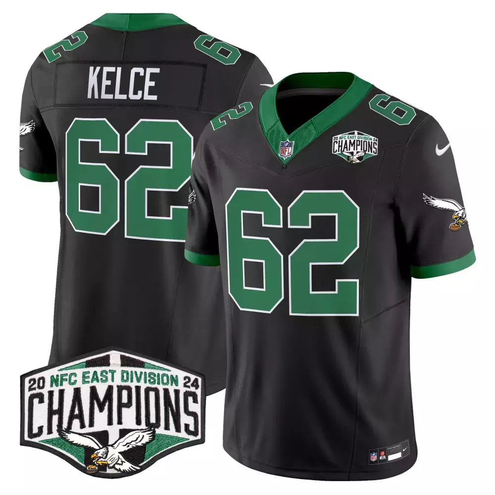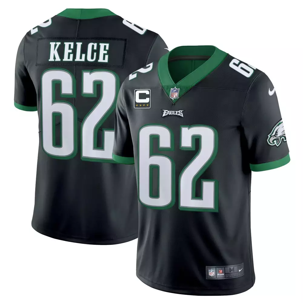Jason Kelce Black Mens Jerome Brown Patch Kelly Green Gold Trim Jersey | Philadelphia Eagles | All Stitched | For Men, Women & Youth;Jason Kelce Black Mens Kelly Green 2024 NFC East Champions Vapor Limited Jersey | Philadelphia Eagles | All Stitched | For Men, Women & Youth;Jason Kelce Black Mens Kelly Green 2024 NFC East Champions Vapor Limited Jersey V2 | Philadelphia Eagles | All Stitched | For Men, Women & Youth;Jason Kelce Black Mens Kelly Green Limited Jersey | Philadelphia Eagles | All Stitched | For Men, Women & Youth;Jason Kelce Black Mens Kelly Green Super Bowl LIX Patch Vapor Limited Jersey | Philadelphia Eagles | All Stitched | For Men, Women & Youth