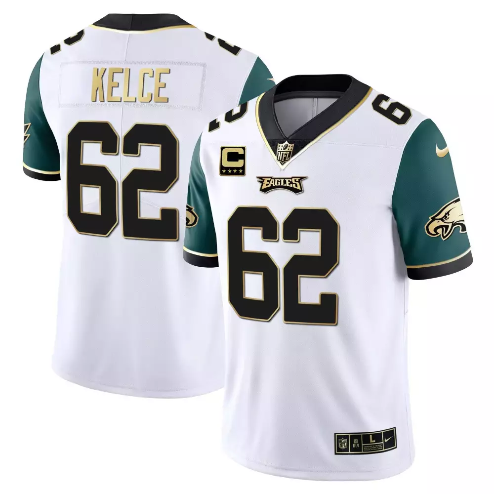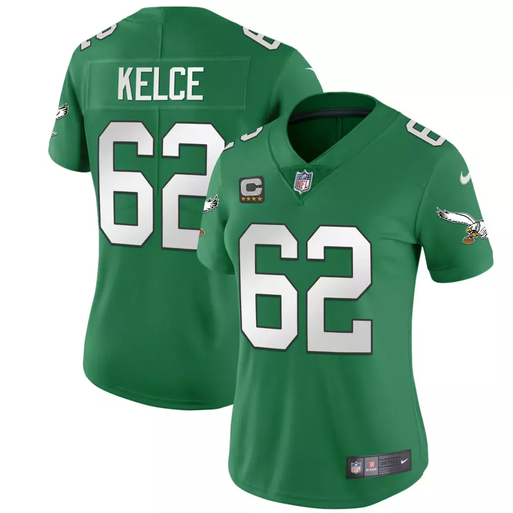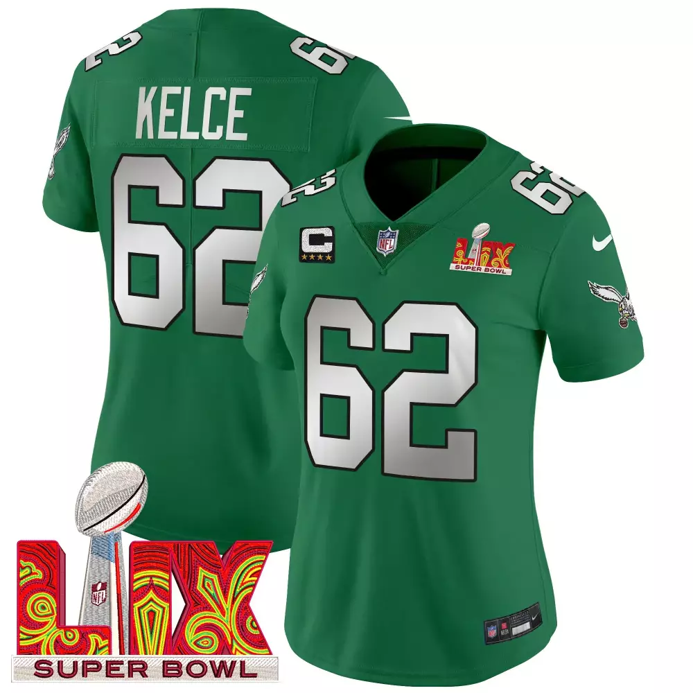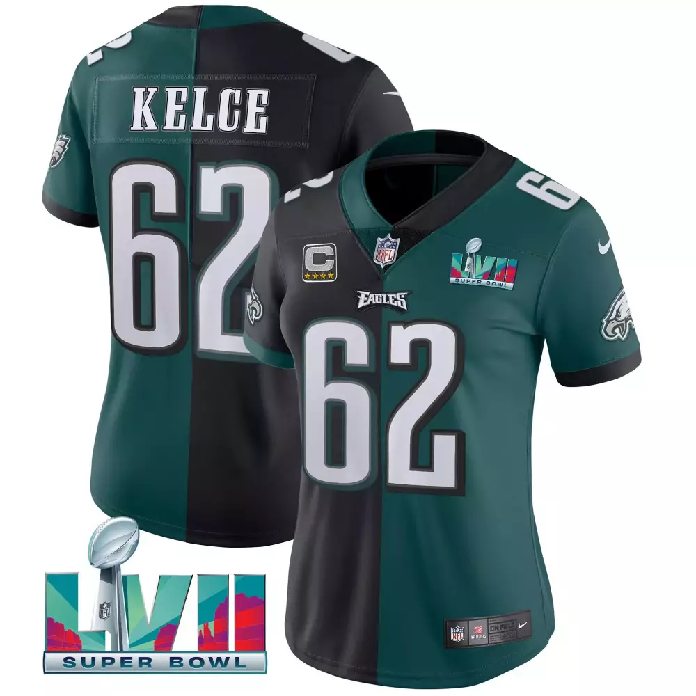 Jason Kelce Women’s Philadelphia Eagles Nike Player Jersey | Kelly Green Fan Gear for Men, Women & Youth;Jason Kelce Women’s Philadelphia Eagles Super Bowl LIX Patch Vapor Limited Jersey | Stitched Fan Gear | For Women;Jason Kelce Women’s Philadelphia Eagles Throwback Kelly Vapor Limited Jersey V2 | Stitched Fan Gear | For Women;Jason Kelce Women’s Split Black Green Super Bowl LVII Jersey | All Stitched Fan Gear for Men, Women & Youth;Jason Kelce Youth Midnight Green Gold Split Vapor Jersey | All Stitched Fan Gear for Men, Women & Youth