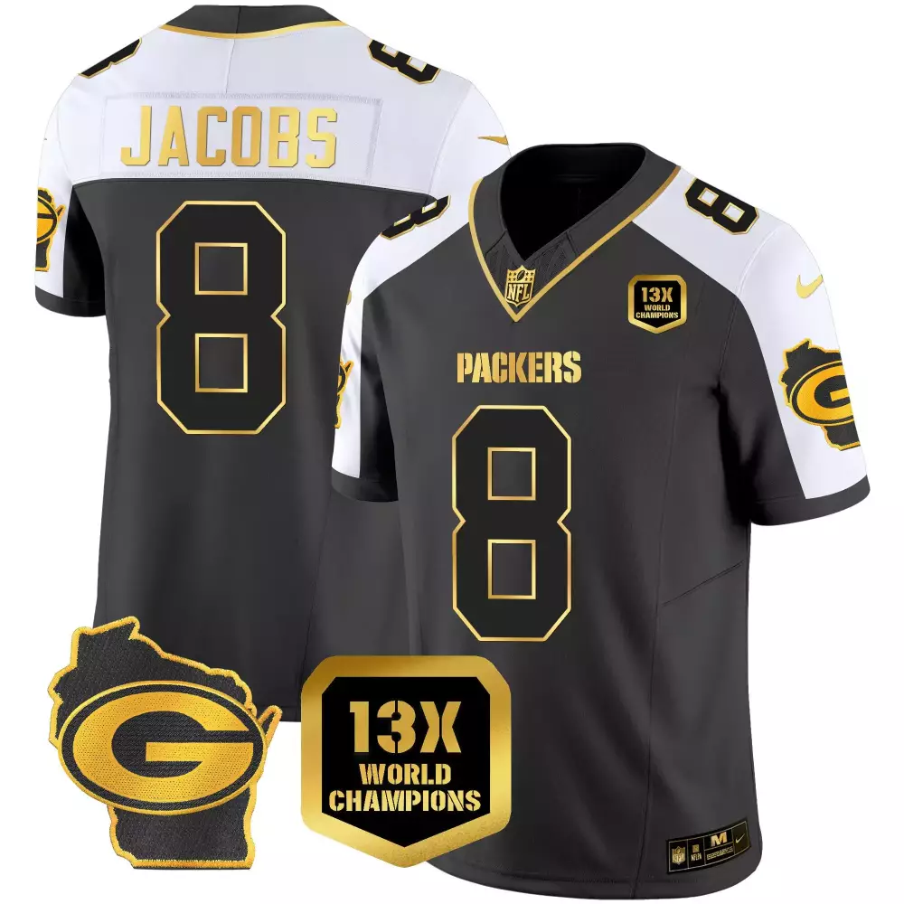 Josh Jacobs 13-Time Champions Gold Vapor Jersey | Green Bay Packers Stitched Fan Gear | For Men, Women & Youth;Josh Jacobs 13-Time World Champions Home Patch Gold Vapor Jersey | Green Bay Packers Fan Gear | For Men, Women & Youth;Josh Jacobs 13-Time World Champions Home Patch Vapor Limited Jersey | Green Bay Packers Fan Gear | For Men, Women & Youth;Josh Jacobs 8 Green Bay Packers 100th Season Limited Stitched Jersey | White Vapor Style | For Men, Women & Youth;Josh Jacobs 8 Green Bay Packers 100th Season White Limited Jersey | All Stitched Vapor Fan Gear | For Men, Women & Youth