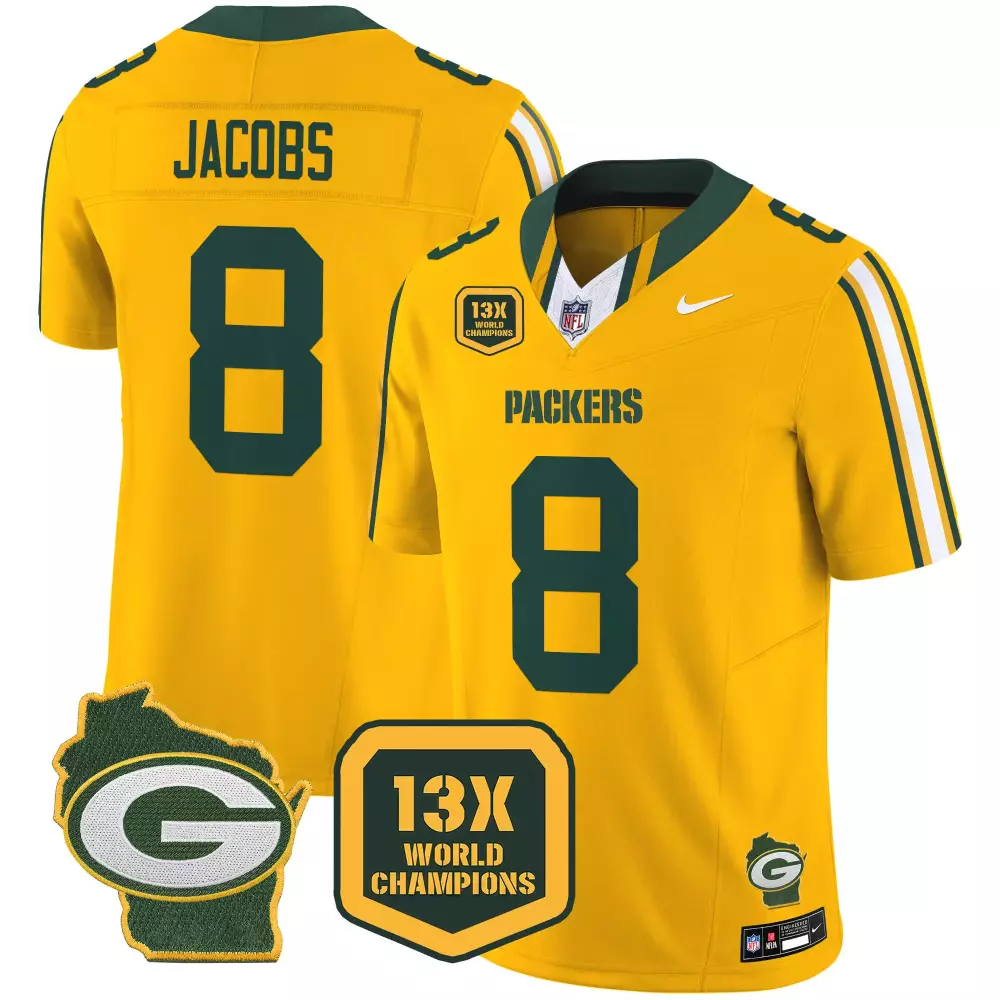 Josh Jacobs Gold Men’s 100th Season Home Patch Vapor Limited Jersey | Green Bay Packers Fan Gear | For Men, Women & Youth;Josh Jacobs Gold Men’s 13-Time World Champions Home Patch Vapor Limited Jersey | Green Bay Packers Fan Gear | For Men, Women & Youth;Josh Jacobs Gold Men’s Cheese Vapor Limited Jersey | Green Bay Packers Fan Gear | For Men, Women & Youth;Josh Jacobs Gold Men’s John Madden Home Patch Game Jersey | Green Bay Packers Fan Gear | For Men, Women & Youth;Josh Jacobs Gold Men’s John Madden Home Patch Vapor Limited Jersey | Green Bay Packers Fan Gear | For Men, Women & Youth