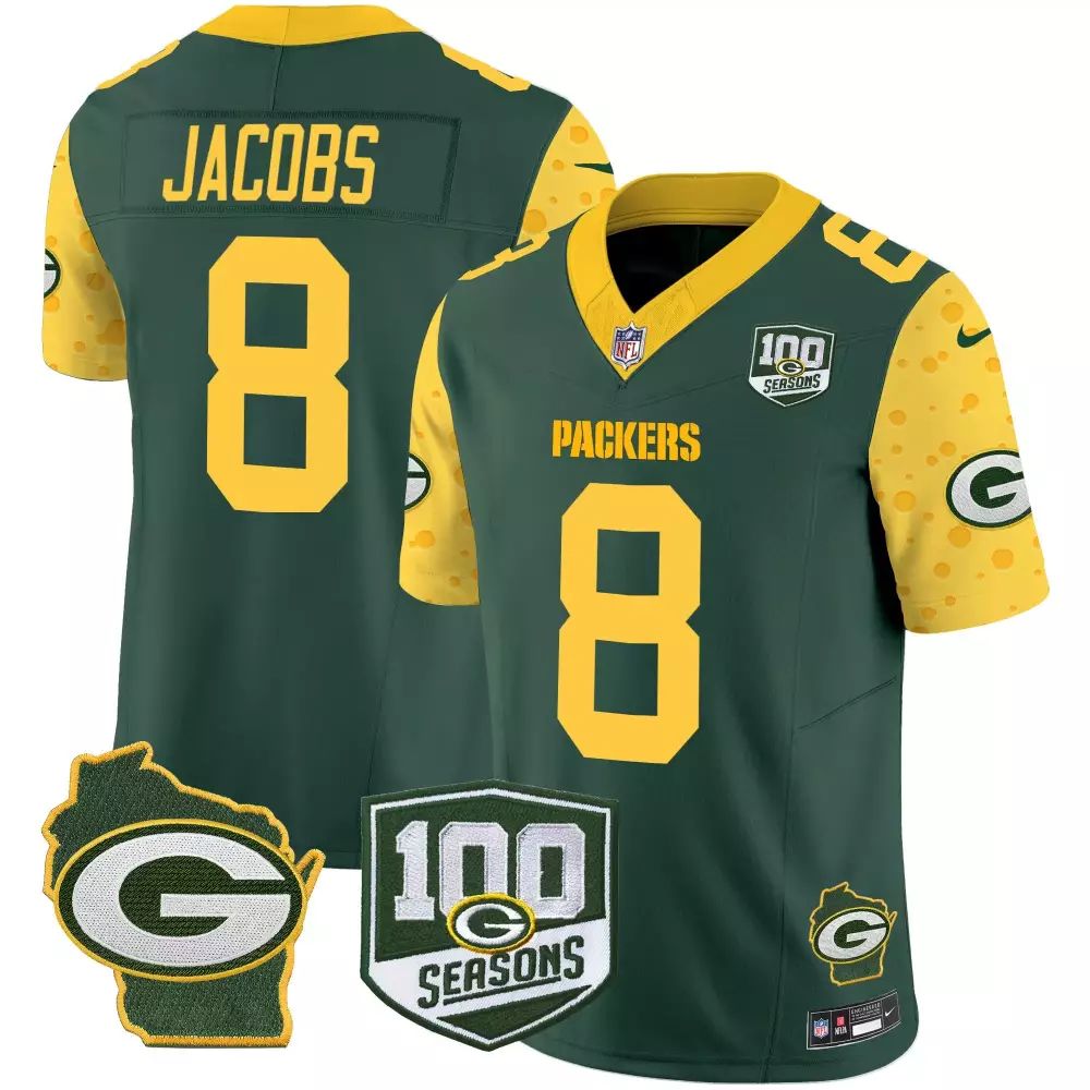 Josh Jacobs Green Bay Packers 100th Season Home Patch Jersey | Green Alternate Vapor Limited Edition | For Men, Women & Youth
