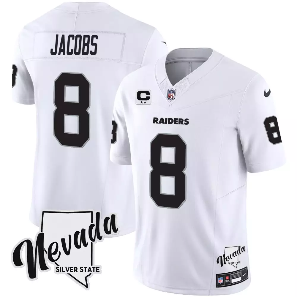 Josh Jacobs Nevada Home Patch White Jersey | Stitched Vapor Style | Limited Edition Fan Gear | For Men, Women & Youth;Josh Jacobs Nevada Silver State Patch White Jersey | Stitched Vapor Style | Limited Edition Fan Gear | For Men, Women & Youth;Josh Jacobs Vapor Limited White Jersey | Stitched Style | Limited Edition Fan Gear | For Men, Women & Youth;Josh Jacobs Women’s 2022 Salute to Service Olive Jersey | Stitched Style | Limited Edition Fan Gear | For Women & Youth;Josh Jacobs Women’s 60th Season Patch Gold Split Jersey | Stitched Style | Limited Edition Fan Gear | For Women & Youth
