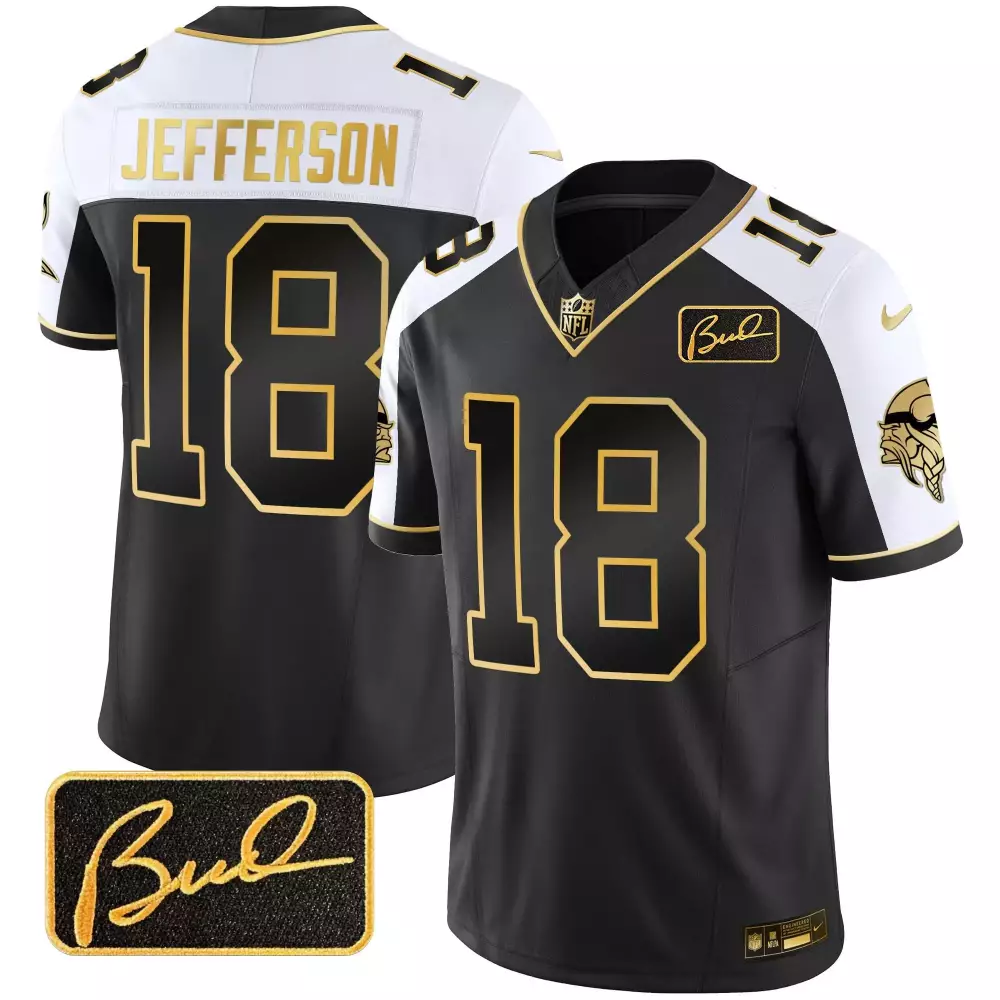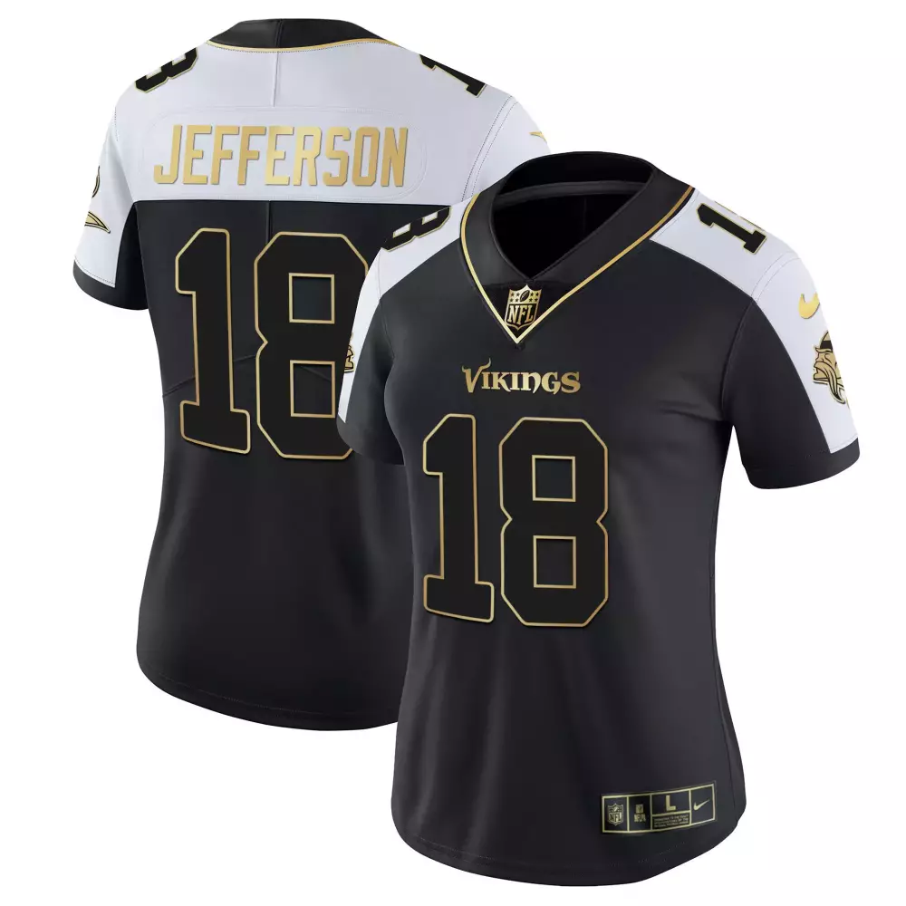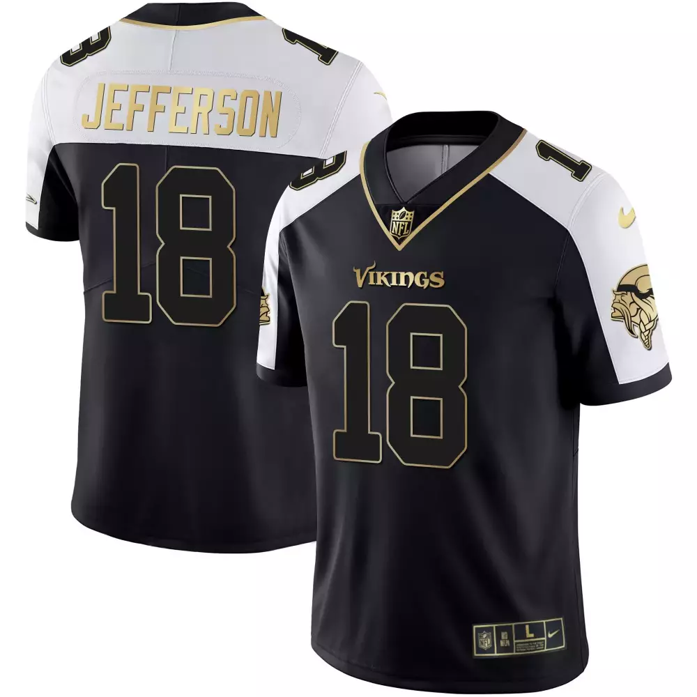 Justin Jefferson 18 Minnesota Vikings Gold Limited Jersey | Bud Grant Patch | All Stitched | For Men;Justin Jefferson 18 Minnesota Vikings Gold Limited Jersey V2 | Bud Grant Patch | All Stitched | For Men;Justin Jefferson 18 Minnesota Vikings Gold Purple Jersey | All Stitched | For Men;Justin Jefferson 18 Minnesota Vikings Women’s Classic Limited Jersey | Bud Grant Patch | All Stitched | For Women;Justin Jefferson 18 Minnesota Vikings Women’s White Gold Black Jersey | All Stitched | For Women