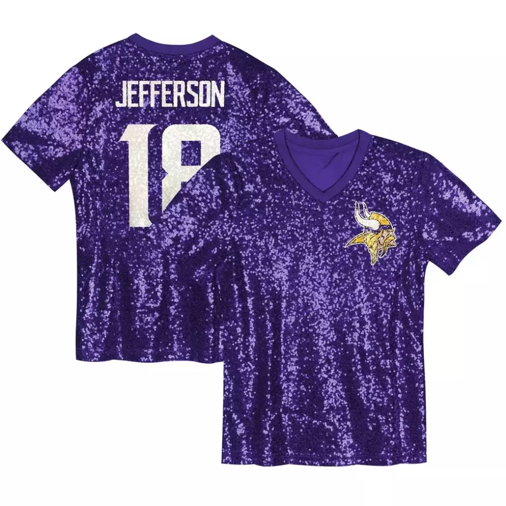 Justin Jefferson Minnesota Vikings Classic Limited Jersey | White Stitched Fan Gear | For Men, Women & Youth;Justin Jefferson Minnesota Vikings Girls Youth Sequin V Neck Fashion Jersey | Purple Fan Gear | For Girls;Justin Jefferson Minnesota Vikings Gray Atmosphere Fashion Game Jersey | Stylish Fan Gear for Every Occasion | For Men, Women & Youth;Justin Jefferson Minnesota Vikings Home Purple Game Jersey | Stitched Fan Gear | For Men, Women & Youth;Justin Jefferson Minnesota Vikings King of the North Patch Game Jersey | White Stitched Fan Gear | For Men, Women & Youth