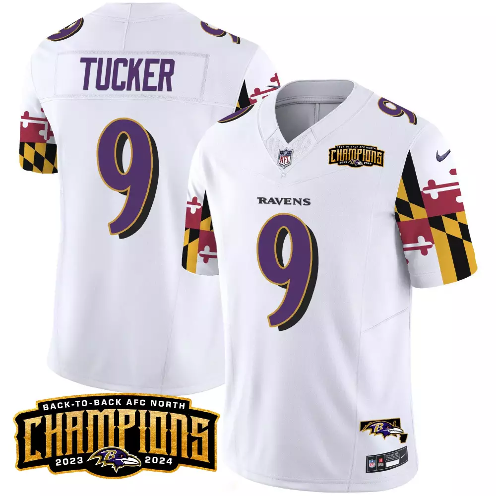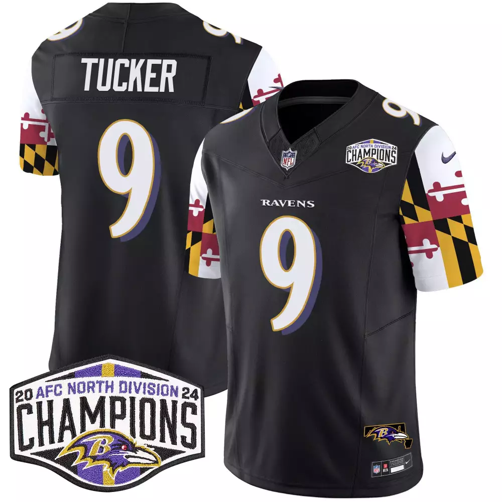 Justin Tucker Baltimore Ravens Maryland Flag 2024 AFC North Champions Patch Vapor Limited Jersey | Stitched Fan Gear for Women | For Women, Men & Youth