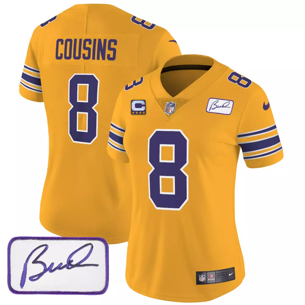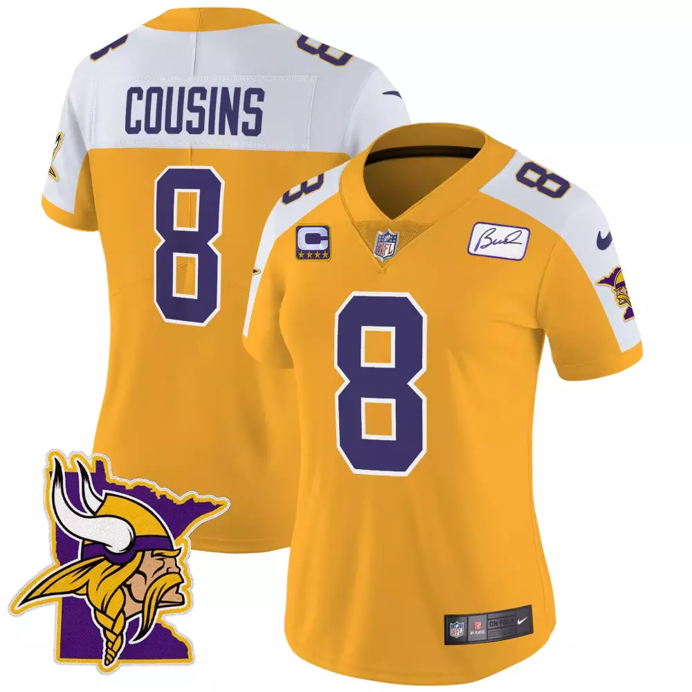 Kirk Cousins Gold Alternate Women’s Minnesota Vikings Bud Grant Patch Classic Jersey | Limited Edition | For Men, Women & Youth