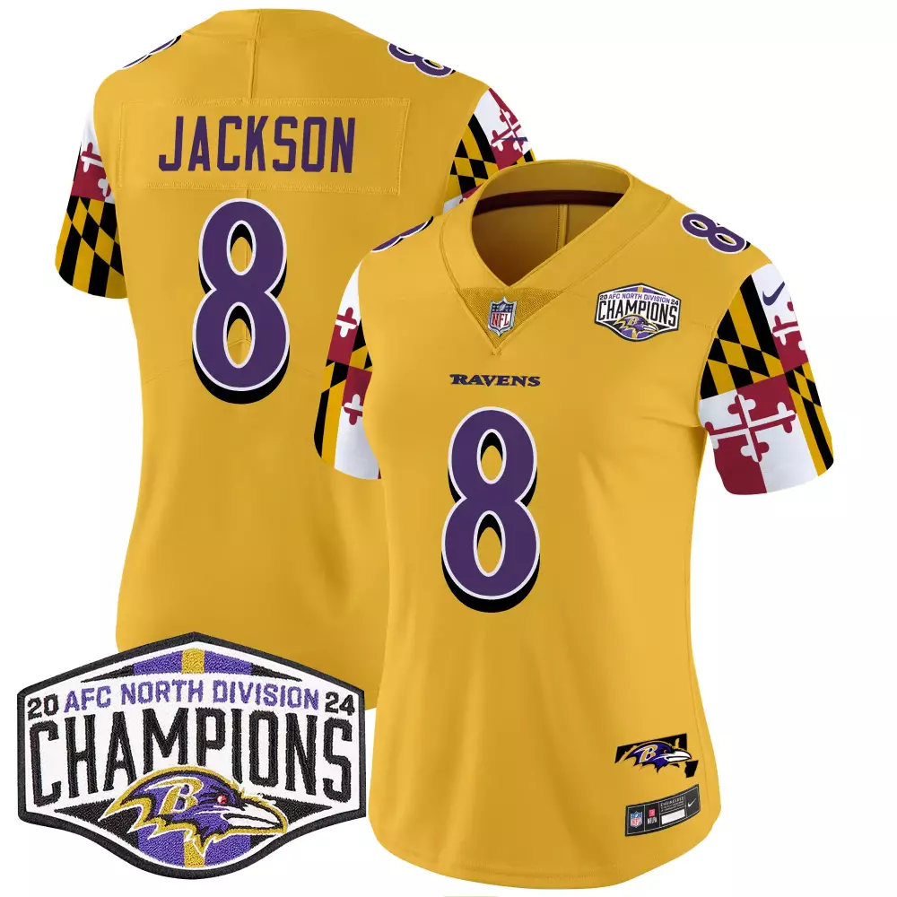 Lamar Jackson Gold Men’s Baltimore Ravens Maryland Flag Back-to-Back AFC North Champions Jersey | Stitched Vapor Limited | For Men, Women & Youth