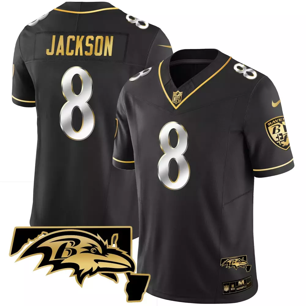 Lamar Jackson Ravens 2024 Vapor Limited Jersey Est 1996 Patch | Stitched Fan Gear | For Men, Women & Youth;Lamar Jackson Ravens Gold Vapor Jersey | Stitched Fan Gear for Women | Limited Edition for Game Day;Lamar Jackson Ravens Gold Vapor Jersey | Stitched Limited Edition | Fan Gear for Men, Women & Youth;Lamar Jackson Ravens Gold Vapor Jersey | Stitched Limited Edition for Women | Fan Gear for Game Day;Lamar Jackson Ravens Maryland Flag Map Champions Jersey | Limited Edition Gold Vapor | Stitched Fan Gear for Men, Women & Youth