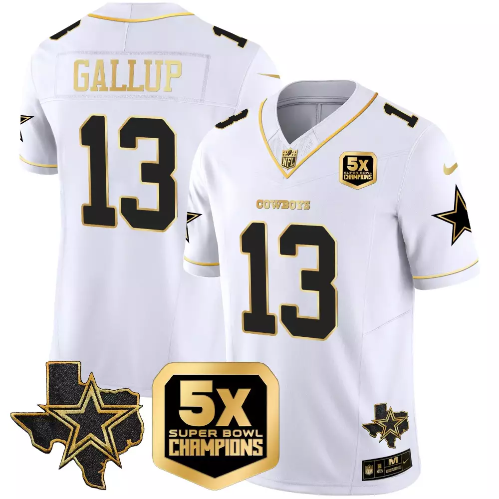 Michael Gallup Dallas Cowboys 2023 NFC East Champions Patch Gold Vapor Jersey | All Stitched Fan Gear | For Men, Women & Youth;Michael Gallup Dallas Cowboys 2023 NFC East Champions Patch Gold Vapor Jersey | Stitched Fan Gear for Men, Women & Youth;Michael Gallup Dallas Cowboys 2024 Salute to Service Vapor Limited Jersey | Arctic Camo | All Stitched Fan Gear for Game Day | For Men, Women & Youth;Michael Gallup Dallas Cowboys 5X Super Bowl Champions Vapor Limited Jersey | All Stitched Fan Gear | For Men, Women & Youth;Michael Gallup Dallas Cowboys 5X Super Bowl Champions Vapor Limited Jersey | Stitched Fan Gear for Men, Women & Youth