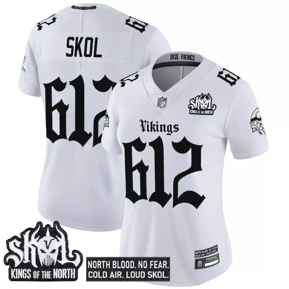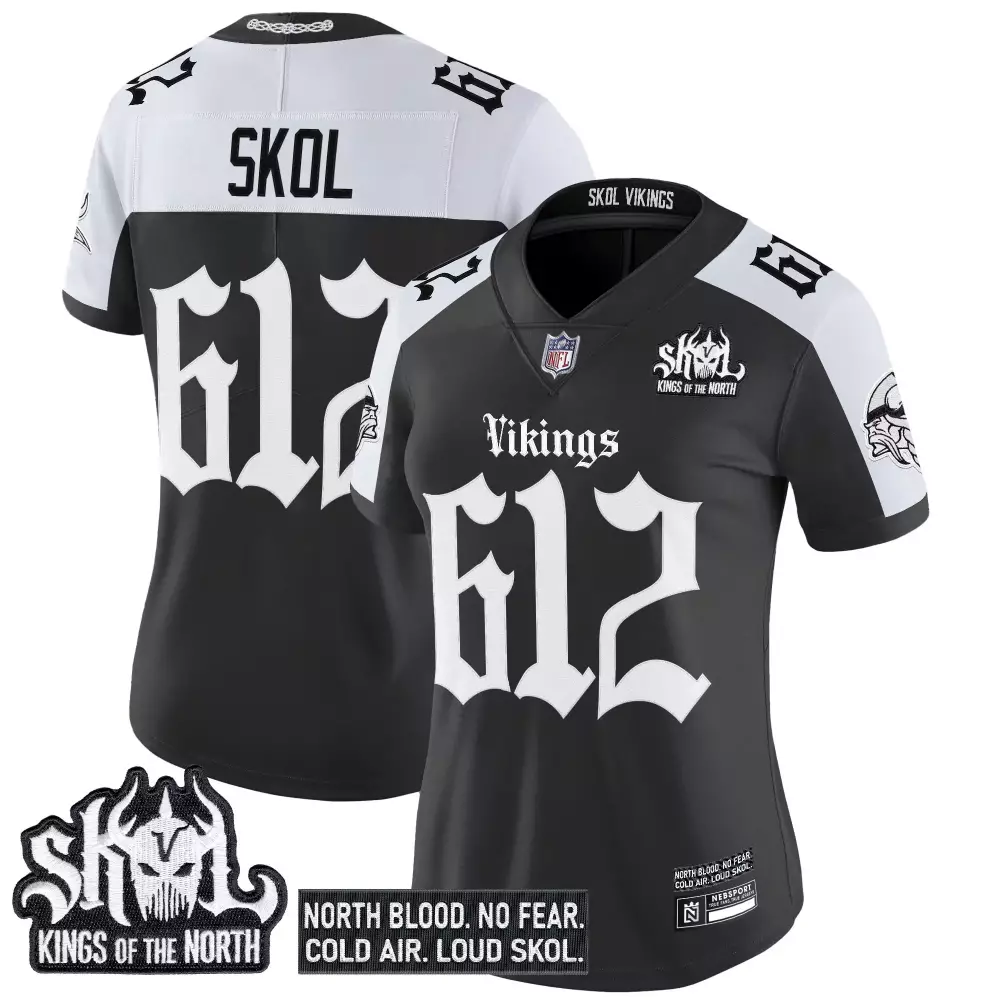 Minnesota Vikings Skol 612 Women’s Black Stitched Jersey | Kings of the North 2023 | Fan Gear for Women & Youth;Minnesota Vikings Skol 612 Women’s Stitched Jersey | White Kings of the North Edition 2023 | Game Day Outfit for Women & Youth;Minnesota Vikings Skol 612 Women’s Stitched Jersey | White with Name Patch 2023 | Fan Gear for Women & Youth;Minnesota Vikings Skol 612 Women’s Stitched Vapor Jersey | Black Name Patch 2025 | Limited Edition Fan Gear for Women & Youth;Minnesota Vikings Skol 612 Women’s Stitched Vapor Jersey | White Kings of the North Patch 2025 | Game Day Outfit for Women & Youth