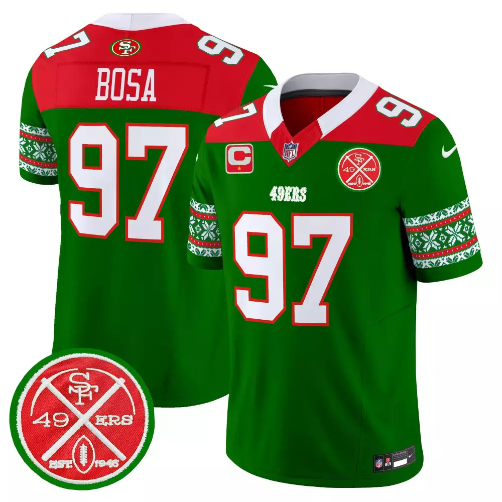 Nick Bosa San Francisco 49ers Faithful to the Bay Limited Jersey | White Vapor Style | Fan Gear for Men, Women & Youth;Nick Bosa San Francisco 49ers Faithful Vapor Jersey | Black & White | Men’s Stitched Fan Gear | For Men, Women & Youth;Nick Bosa San Francisco 49ers Game Jersey | Black | Women’s Fan Gear | Perfect for Game Day | For Men, Women & Youth;Nick Bosa San Francisco 49ers Green Men’s 2024 Christmas Jersey | Stitched Vapor Limited Edition | For Men, Women & Youth;Nick Bosa San Francisco 49ers Green Men’s Mexico Limited Jersey V4 | Stitched Vapor Fan Gear | For Men, Women & Youth
