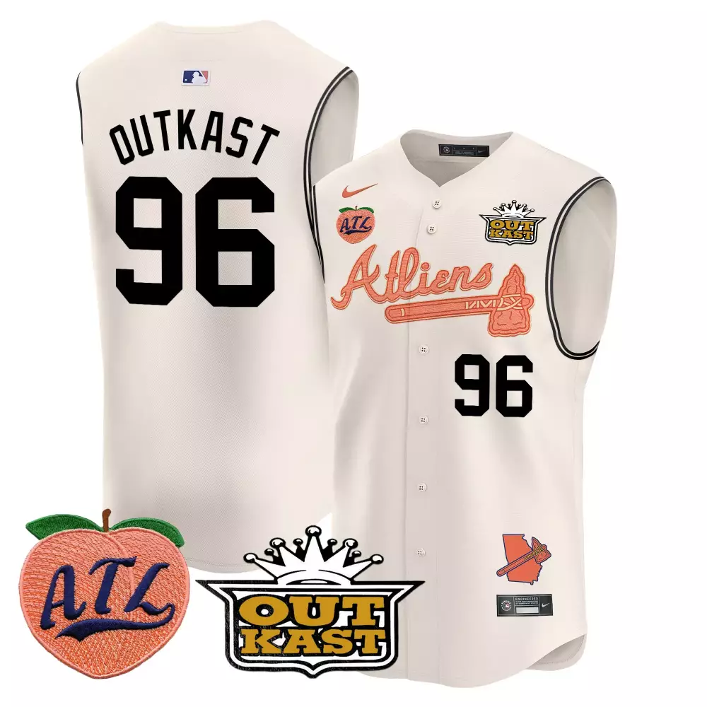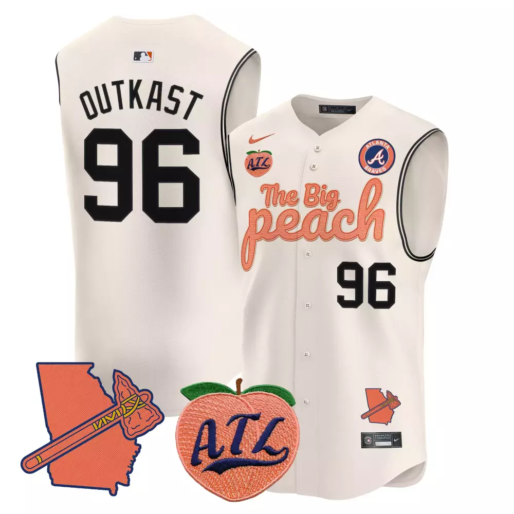 Outkast 96 Atlanta Braves Cream Stitched Jersey | The Big Peach Style for Men | Name Patch 2023 | Fan Gear | For Men, Women & Youth