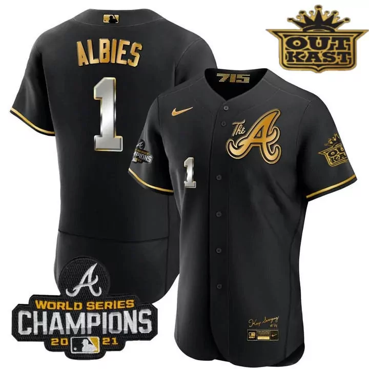 Ozzie Albies Atlanta Braves Outkast Gold The A Flex Base Jersey | Black Gold Stitched Fan Gear | For Men, Women & Youth