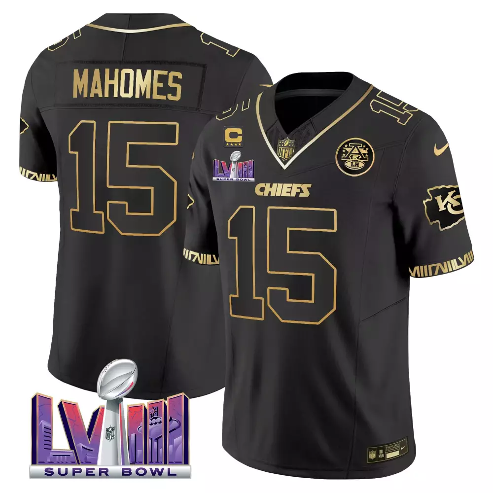 Patrick Mahomes 15 Kansas City Chiefs 2023 Men’s Black Stitched Jersey | Name Patch Super Bowl LVIII Edition | Fan Gear | For Men, Women & Youth