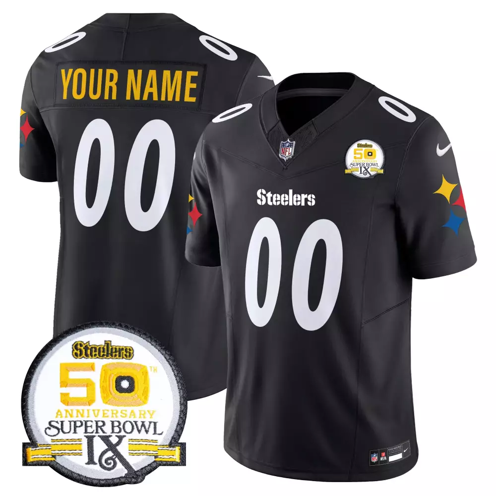 Pittsburgh Steelers Black Men’s 50th Anniversary Super Bowl IX Vapor Limited Custom Jersey | Stitched Design | For Men, Women & Youth;Pittsburgh Steelers Black Men’s 50th Anniversary Super Bowl IX Vapor Limited Custom Jersey | Stitched Design | For Men, Women & Youth;Pittsburgh Steelers Black Men’s 50th Anniversary Super Bowl IX Vapor Limited Custom Jersey V2 | Stitched Design | For Men, Women & Youth;Pittsburgh Steelers Black Men’s 80th Anniversary Vapor Limited Custom Jersey | Stitched Design | Fan Gear for Game Day | For Men, Women & Youth;Pittsburgh Steelers Black Men’s Arch Smoke 412 Vapor Limited Custom Jersey | Stitched Design | Fan Gear for Game Day | For Men, Women & Youth