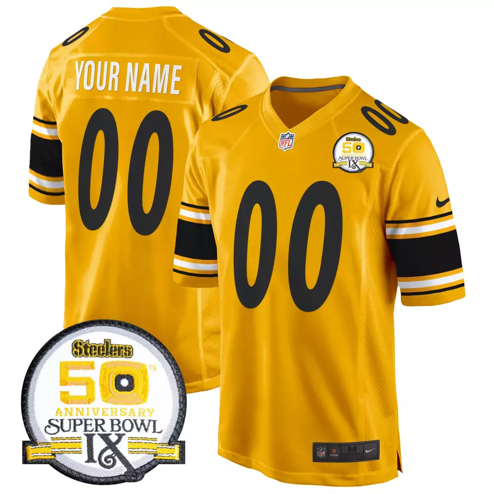 Pittsburgh Steelers Game White Custom Jersey | Stitched White | Personalized Name & Number | For Women;Pittsburgh Steelers Game White Custom Jersey | Stitched White | Personalized Name & Number | For Youth;Pittsburgh Steelers Gold 50th Anniversary Super Bowl IX Patch Jersey | Custom Stitched Vapor Limited Edition | Fan Gear for Men, Women & Youth;Pittsburgh Steelers Gold 50th Anniversary Super Bowl IX Patch Vapor Jersey | Limited Edition Custom Stitched | Fan Gear for Men, Women & Youth;Pittsburgh Steelers Gold 50th Anniversary Super Bowl IX Patch Vapor Jersey V2 | Custom Stitched Limited Edition | Fan Gear for Men, Women & Youth