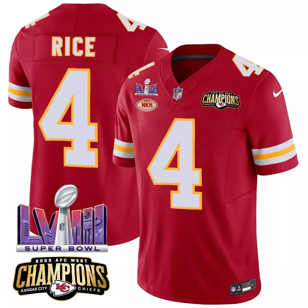Rashee Rice Red Men’s Kansas City Chiefs AFC West Champions Super Bowl LVIII Gold Patch Vapor Jersey | All Stitched Fan Gear | For Men, Women & Youth