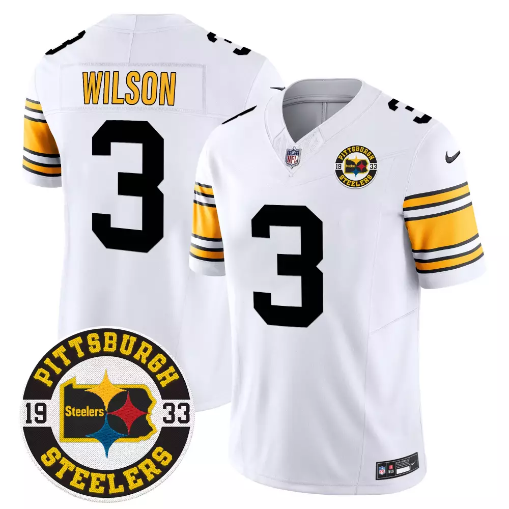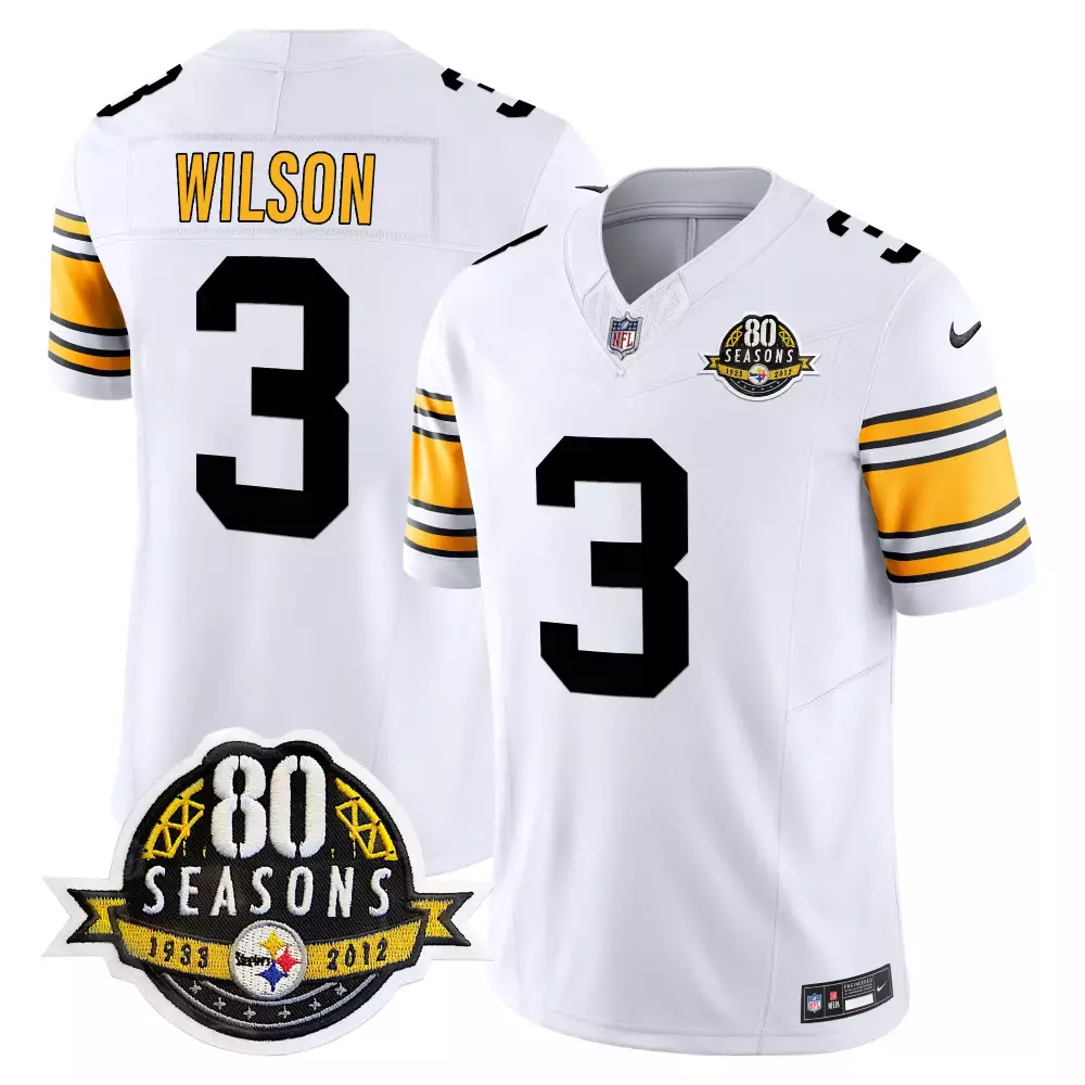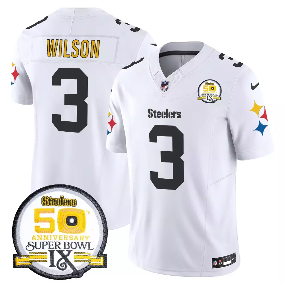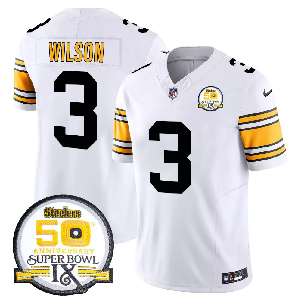 Russell Wilson 1975 White Men’s Pittsburgh Steelers 50th Anniversary Vapor Limited Jersey | Super Bowl IX Patch | For Men, Women & Youth;Russell Wilson 1975 White Men’s Pittsburgh Steelers 50th Anniversary Vapor Limited Jersey V2 | Super Bowl IX Patch | For Men, Women & Youth;Russell Wilson 1975 White Men’s Pittsburgh Steelers 80th Anniversary Vapor Limited Jersey | Stitched Design | For Men, Women & Youth;Russell Wilson 1975 White Men’s Pittsburgh Steelers Throwback Vapor Limited Jersey | Stitched Design | Fan Gear for Game Day | For Men, Women & Youth;Russell Wilson 1975 White Men’s Pittsburgh Steelers Vapor Limited Jersey | Est 1933 Patch | Game Day Fan Gear | For Men, Women & Youth