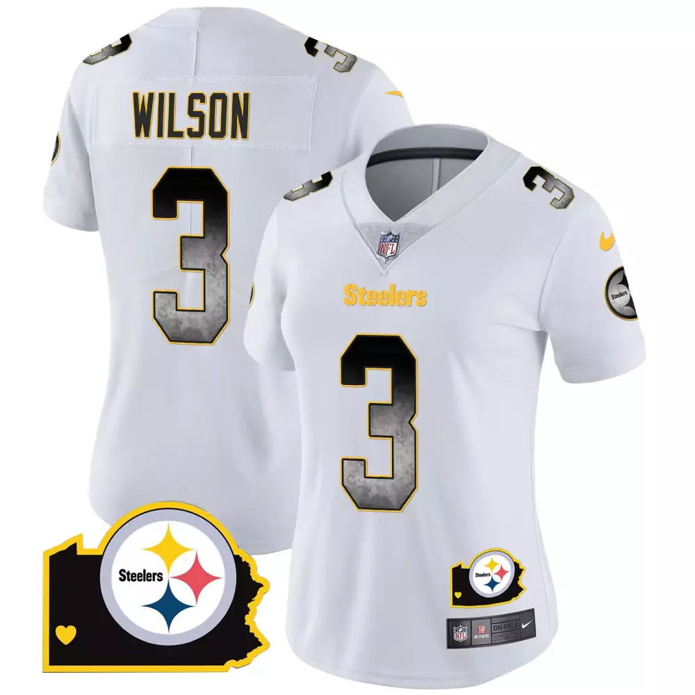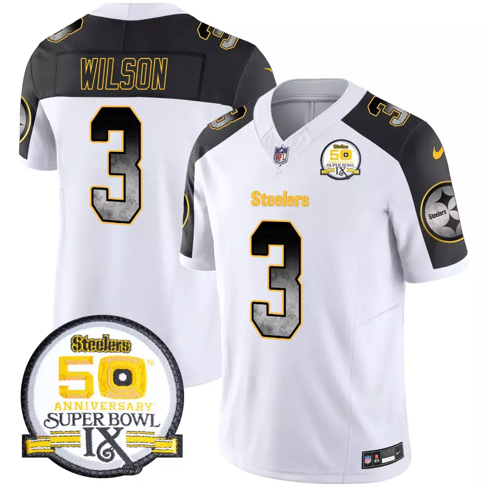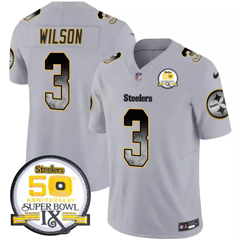 Russell Wilson Pittsburgh Steelers Arch Smoke 50th Anniversary Vapor Limited Jersey | Gold Stitched Fan Gear | For Men, Women & Youth;Russell Wilson Pittsburgh Steelers Arch Smoke 50th Anniversary Vapor Limited Jersey | Gray Stitched Fan Gear | For Men, Women & Youth;Russell Wilson Pittsburgh Steelers Arch Smoke 50th Anniversary Vapor Limited Jersey | Inverted Men’s Stitched Fan Gear | For Men, Women & Youth;Russell Wilson Pittsburgh Steelers Arch Smoke Home Patch Vapor Jersey | White for Women | Fan Gear for All;Russell Wilson Pittsburgh Steelers Arch Smoke Home Patch Vapor Jersey | White Stitched Design | Fan Gear for All