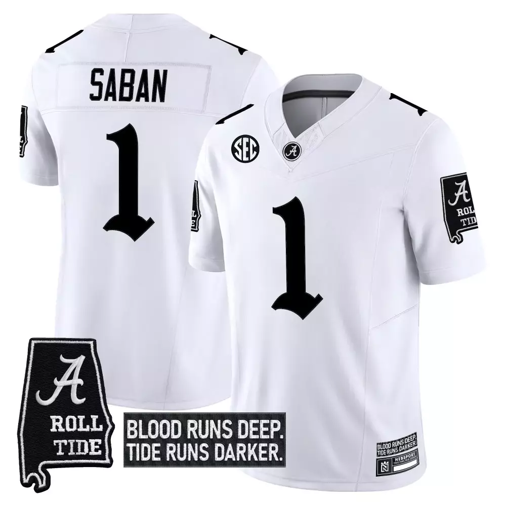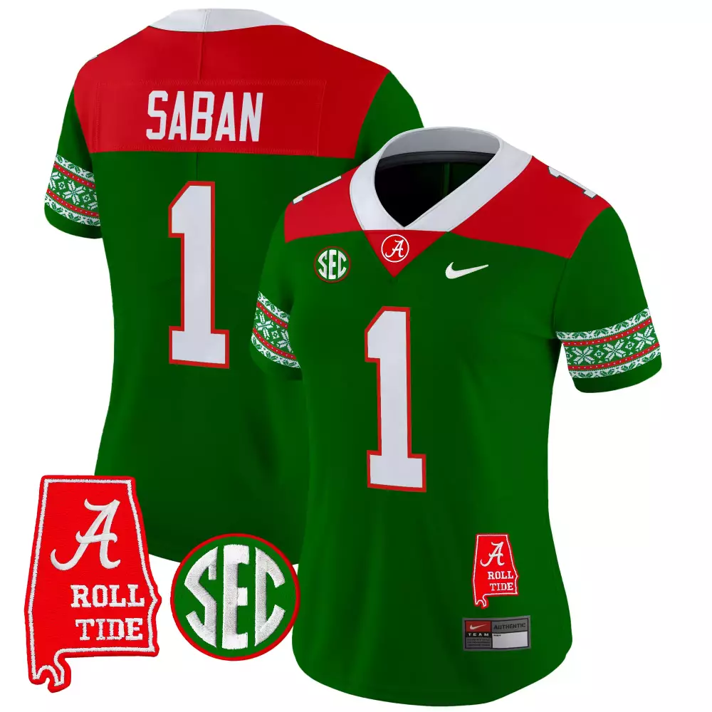 Saban 1 Alabama Crimson Tide White Vapor Jersey | Embroidered Patches 2023 | For Men, Women & Youth;Saban 1 Alabama Crimson Tide Women’s 2024 Red Christmas Jersey | Stitched Name Patch | Fan Gear for Women & Youth;Saban Alabama Crimson Tide 2023 Blood Runs Deep Edition Jersey | White Stitched | Limited Edition Fan Gear | For Men, Women & Youth;Saban Alabama Crimson Tide 2023 Stitched Jersey | Black Name Patch | Replica Fan Gear | For Men, Women & Youth;Saban Alabama Crimson Tide 2024 Christmas Jersey | Green Stitched | Limited Edition Fan Gear | For Women, Men & Youth