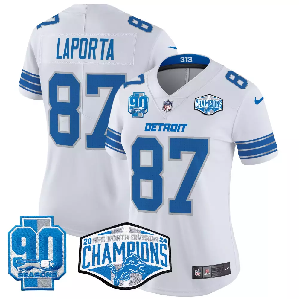 Sam Laporta Women’s 2024 NFC North Division Champions Gold Trim Jersey | White Vapor Stitched | Limited Edition Fan Gear | For Men, Women & Youth