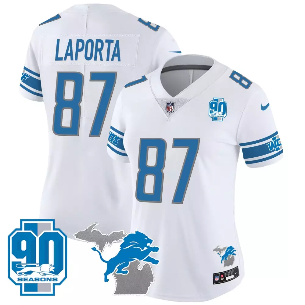 Sam Laporta Women’s 90th Year Michigan Patch Jersey | White Vapor Stitched | Limited Edition Fan Gear | For Men, Women & Youth