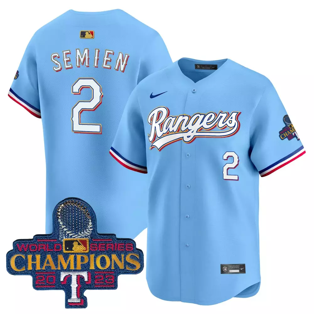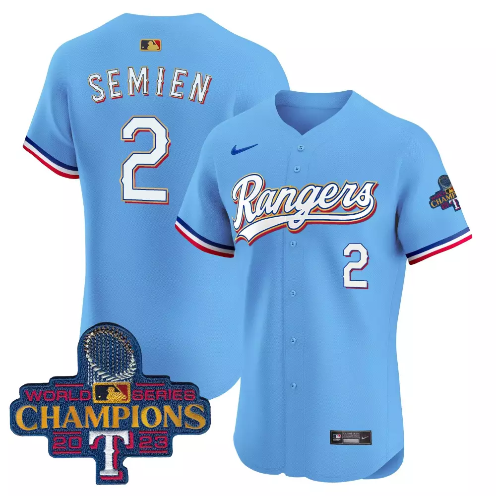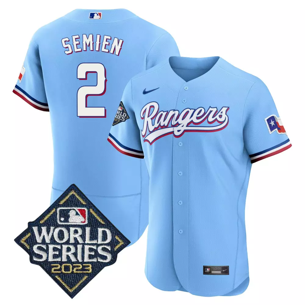 Semien Texas Rangers 2023 World Series Champions Light Blue Jersey | All Stitched Men’s Style | Gift Idea for Fans | For Men, Women & You;Semien Texas Rangers 2023 World Series Champions Light Blue Vapor Jersey | All Stitched Men’s | Fan Gear for Men, Women & You;Semien Texas Rangers 2023 World Series Flex Base Jersey | All Stitched Men’s Light Blue | Fan Gear for Men, Women & You;Semien Texas Rangers 2023 World Series Green Stitched Jersey | Men’s Name Patch | Game Day Outfit for Men, Women & You;Semien Texas Rangers 2023 World Series Jersey | All Stitched Men’s White, Red & Green | Fan Gear for Men, Women & You
