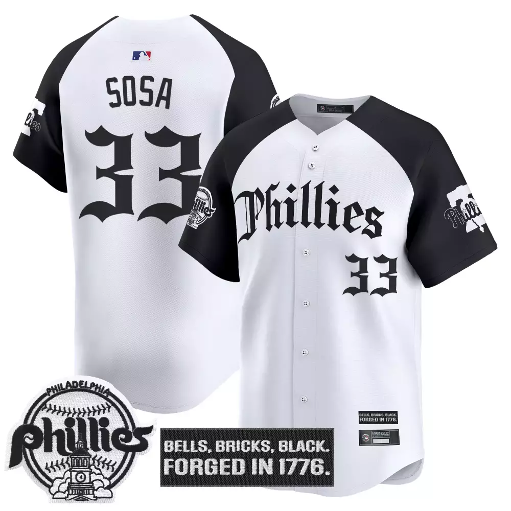 Sosa 33 Philadelphia Phillies 1938 Heritage Collection Vapor Jersey | Cream Stitched Edition | Fan Gear for Men, Women & Youth;Sosa 33 Philadelphia Phillies 1938 Heritage Gray Stitched Vapor Jersey | Special Patch Edition | Fan Gear for Men, Women & Youth;Sosa 33 Philadelphia Phillies 2021 Stitched Vapor Jersey | Black & White Edition | Game Day Outfit for Men, Women & Youth;Sosa 33 Philadelphia Phillies 2023 Limited Edition Vapor Jersey | Black with Embroidered Patch | Fan Gear for Men, Women & Youth;Sosa 33 Philadelphia Phillies 2023 Stitched Vapor Jersey | Black Edition for History Books | Fan Gear for Men, Women & Youth