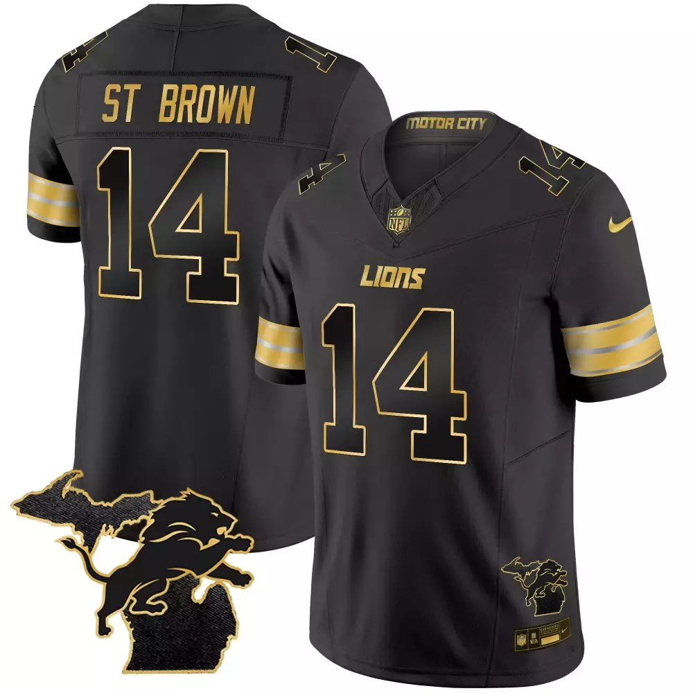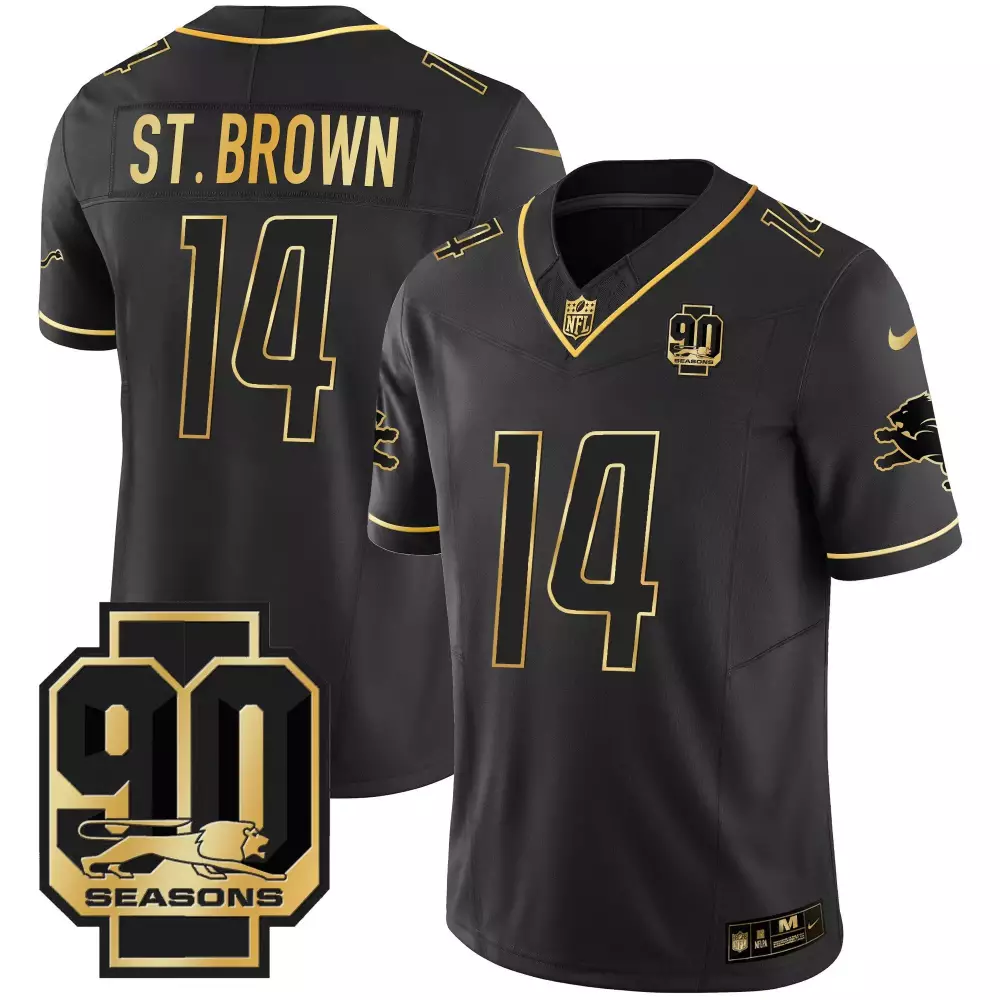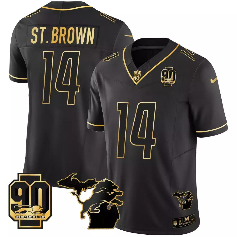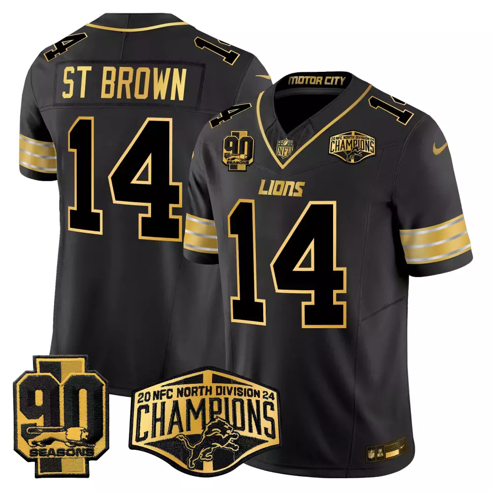 St. Brown Men’s Detroit Lions 2024 Michigan 90th Season Jersey | Black Gold with Patch | Stitched Limited Edition | For Men, Women & Youth;St. Brown Men’s Detroit Lions 2024 Michigan Jersey | Black Gold with Patch | Stitched Vapor Edition | For Men, Women & Youth;St. Brown Men’s Detroit Lions 2024 NFC North Division Champions Jersey | Black Gold with Patch | Stitched Limited Edition | For Men, Women & Youth;St. Brown Men’s Detroit Lions 90th Year Jersey | Black Gold with Patch | Stitched Fan Gear | For Men, Women & Youth;St. Brown Men’s Detroit Lions 90th Year Michigan Jersey | Black Gold with Patch | Stitched Fan Gear | For Men, Women & Youth